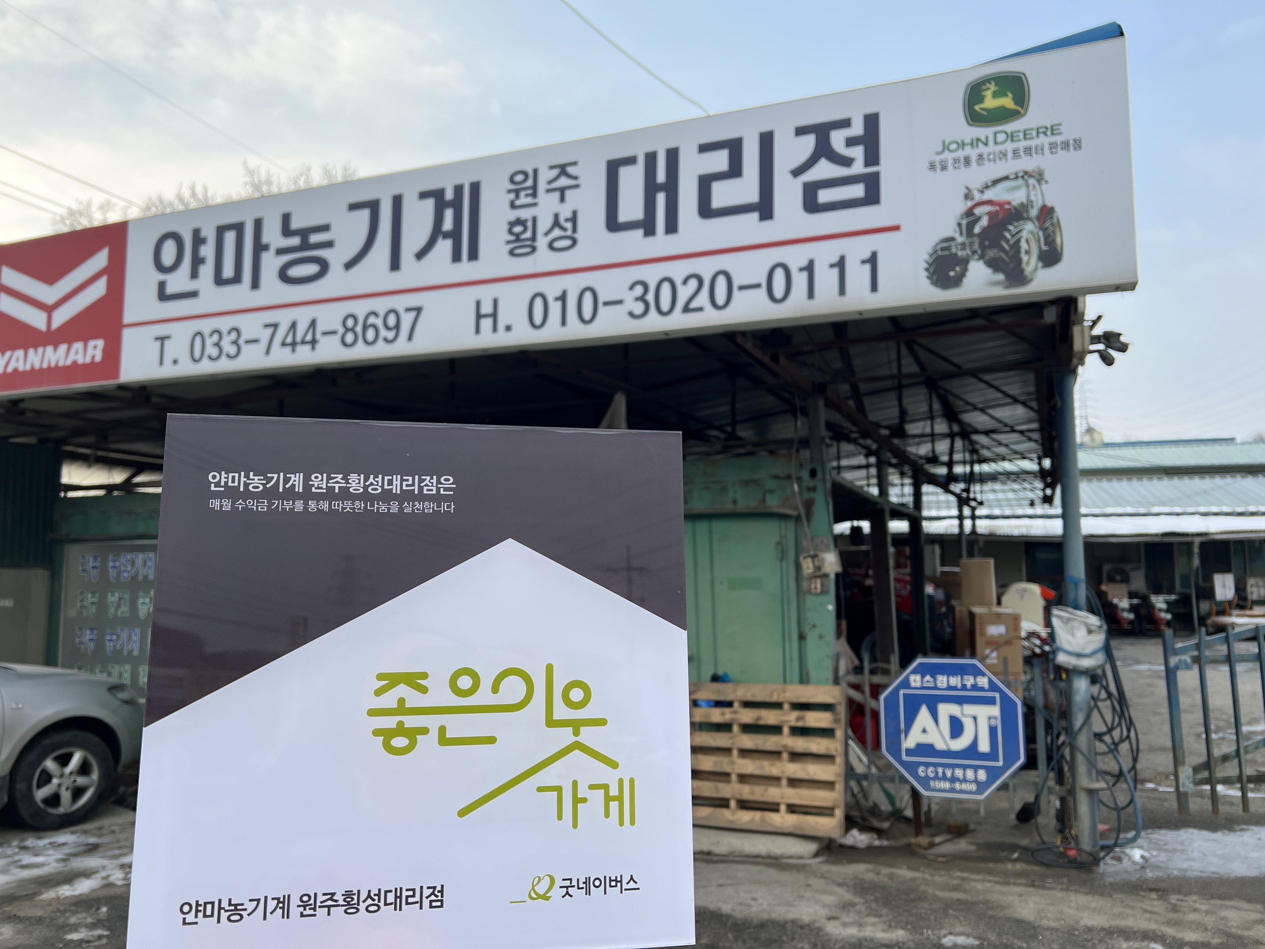 [강원사회복지신문 서은진 기자]=얀마농기계 원주횡성대리점, 매장 수익금의 일부 국내 도움이 필요한 아동 위해 후원 좋은이웃가게, 굿네이버스 대표 나눔 캠페인으로 소상공인을 포함해 누구나 참여 가능 굿네이버스 강원중부지부(지부장 이상욱)는 강원도 원주시에 위치한 얀마농기계 원주횡성대리점(대표 최대길)과 함께...