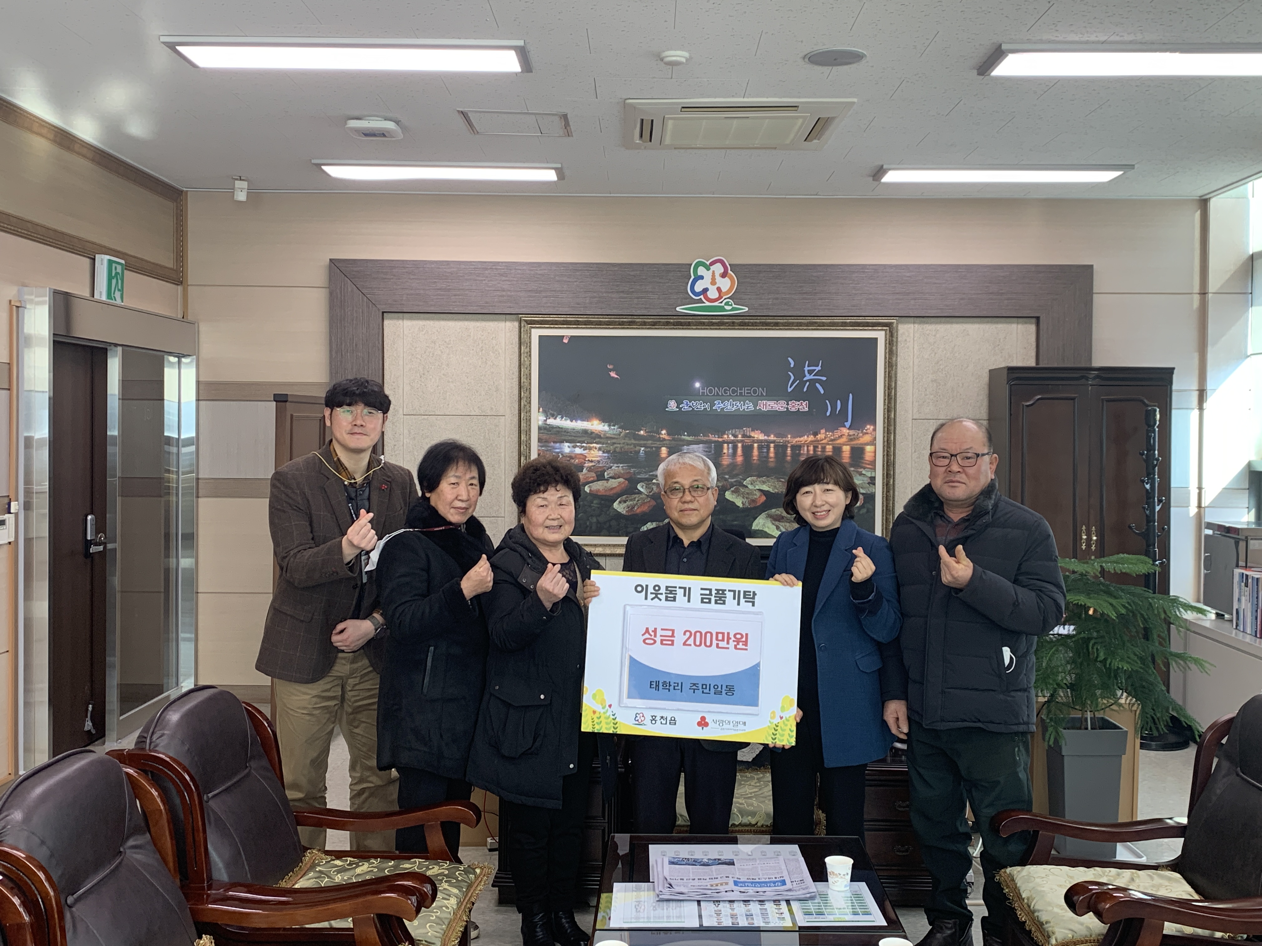 [강원사회복지신문 김종한 기자]=홍천읍 태학리 주민 일동은 지난 1월 30일 홍천읍행정복지센터를 방문해 어려운 이웃돕기 성금 200만원을 전달했다. 이날 성금은 김일수 이장과 한종래 새마을지도자, 최상희 부녀회장, 윤영순 태학리 사무장이 주민 대표로 전달했다. 김일수 이장은 "주민들이 십시일반으로 모은 성금을 이웃...