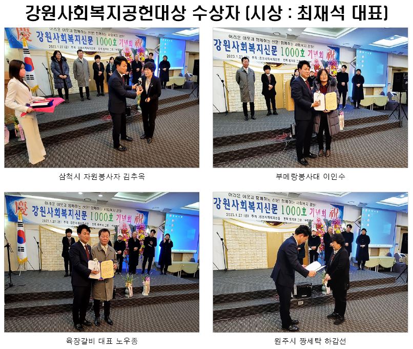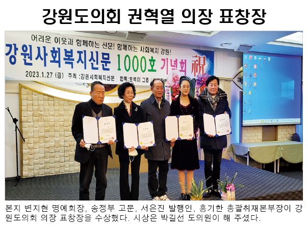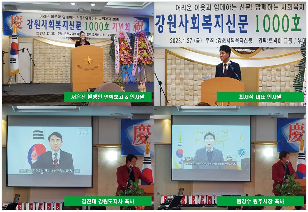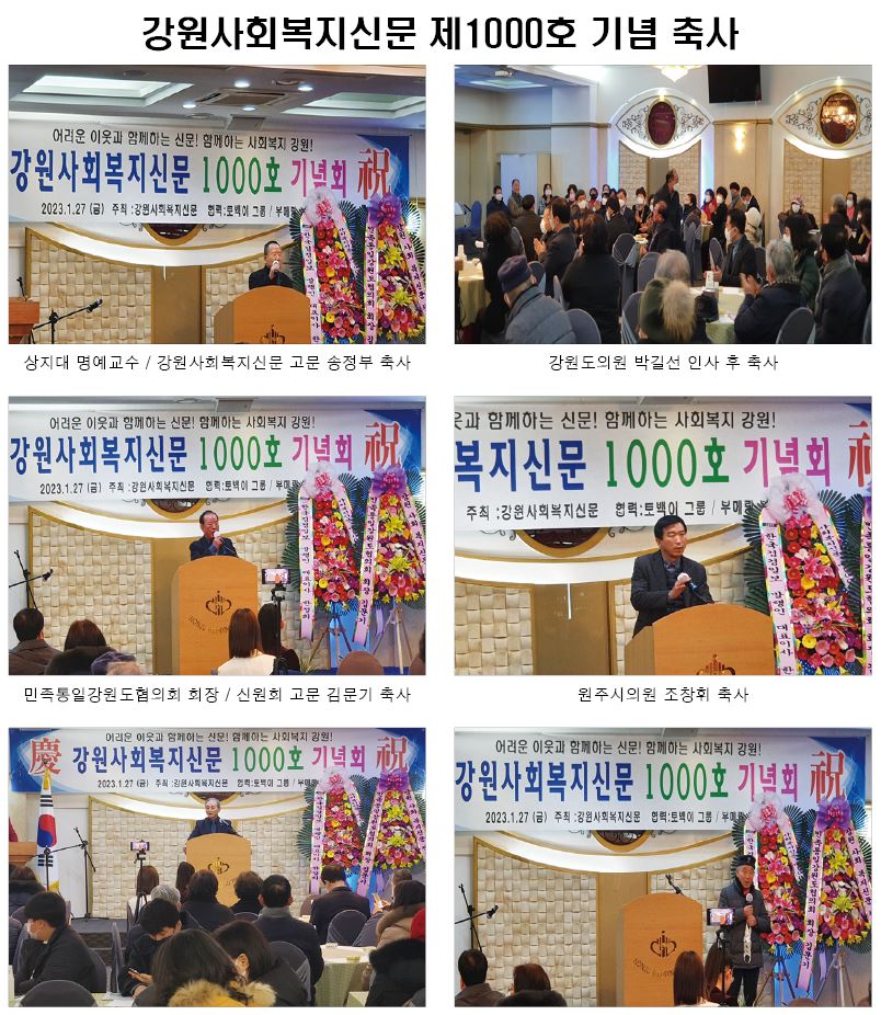 [강원사회복지신문 김도연 기자]=지난 1월 27일(금) 오후5시 원주웨딩타운 3층 로즈마리홀에서 열려 '본지 제1000호 기념식'이 지난 1월 27일 오후 5시 원주웨딩타운 3층 로즈마리홀에서 있었다. 식전공연에 이어 1부에서는 서은진 발행인의 연혁보고와 인사말을 시작으로 최재석 대표의 내빈소개와 참석해 주신 내빈에 대한...
