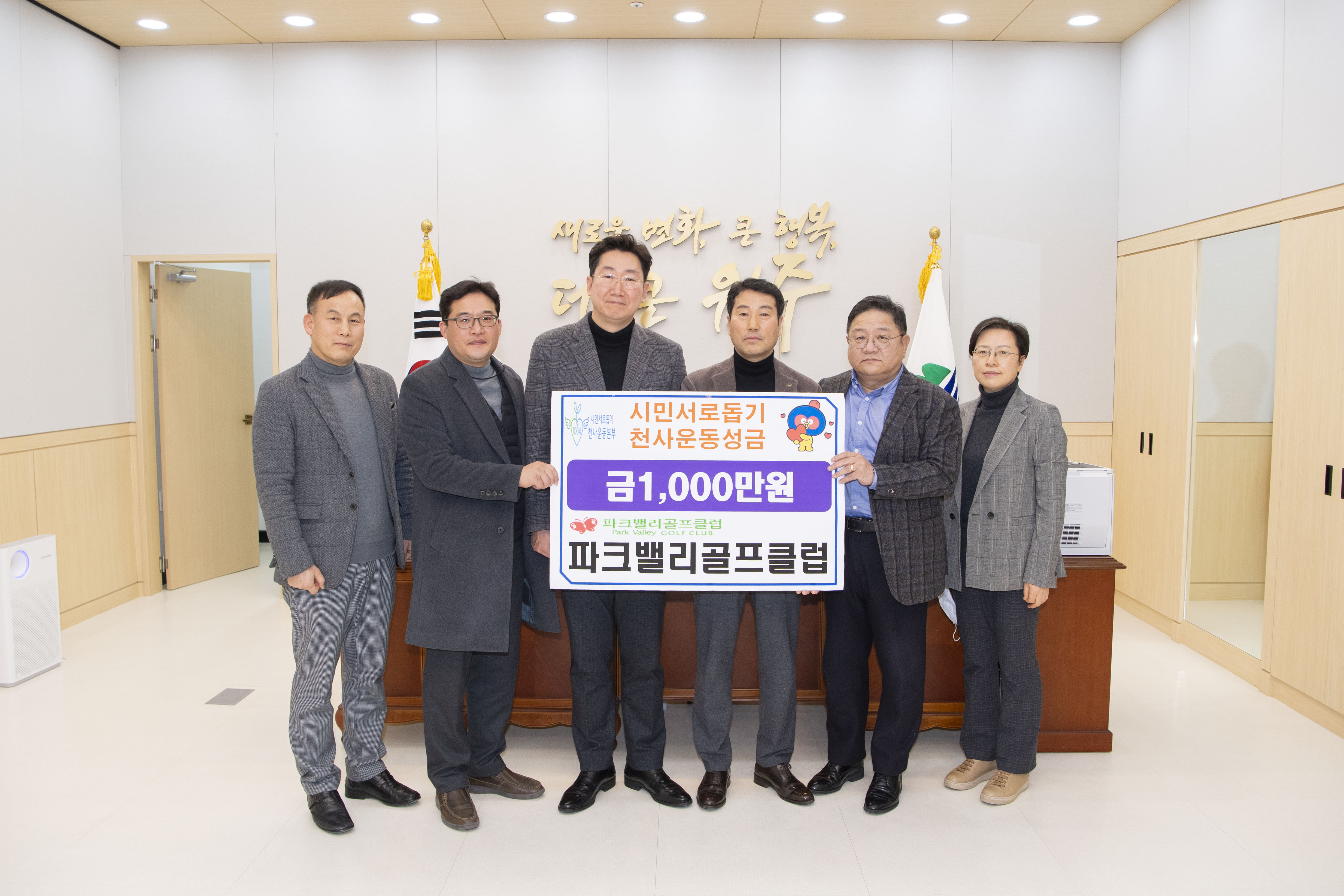 [강원사회복지신문 홍기한 기자]=원주시 소초면 소재 파크밸리 골프클럽(대표이사 유춘식)은 지난 1월 31일 원주시청 시장 집무실에서 천사운동 후원금 1,000만 원을 기탁했다. 이날 전달식에는 유춘식 대표이사, 전명렬 본부장 등 관계자가 참석했다. 유춘식 대표이사는 "지역과 상생하는 기업으로 어려운 이웃과 함께하는 ...