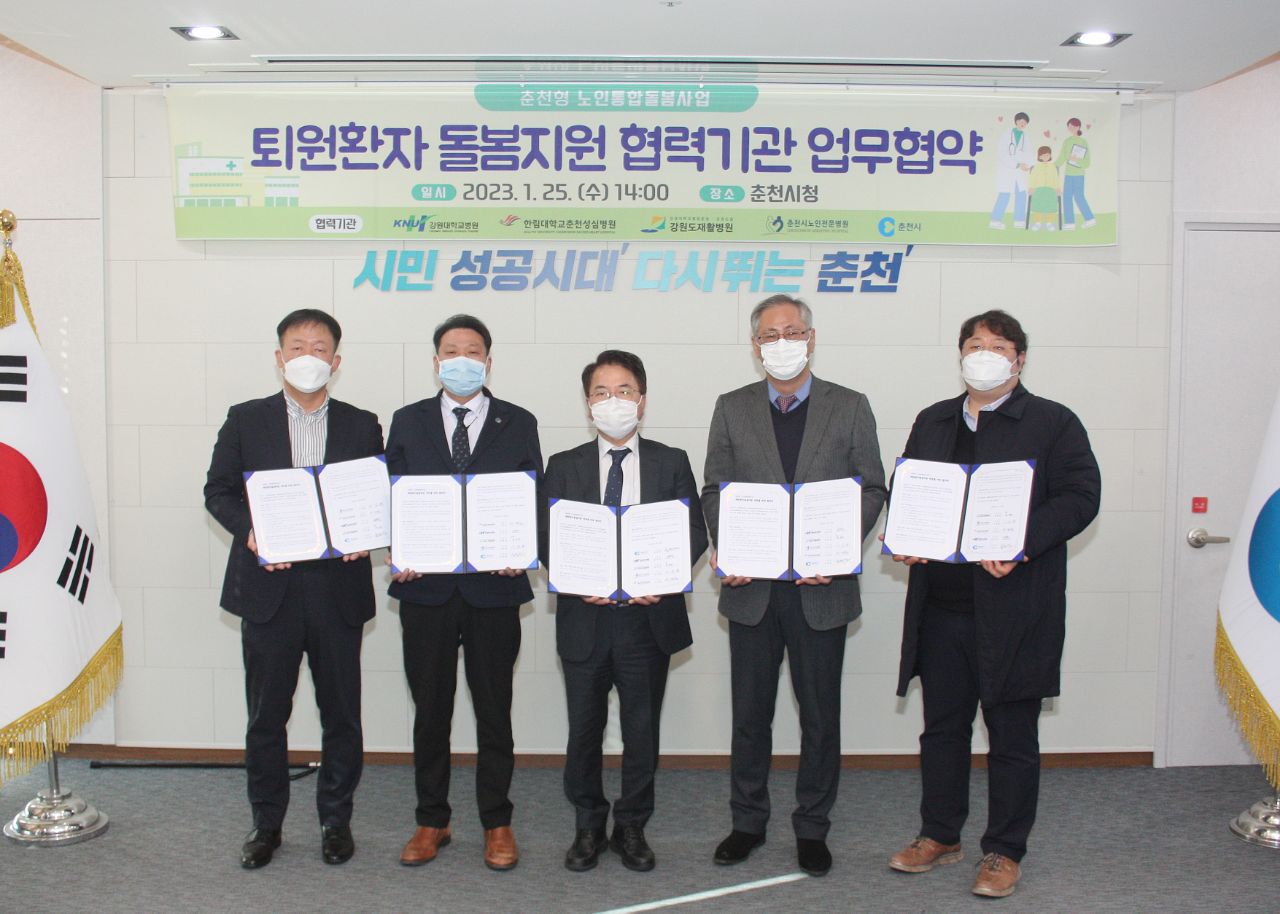 [강원사회복지신문 홍기한 기자]=만 65세 이상 퇴원환자 돌봄서비스 연계 협력 협약 춘천시와 춘천 내 병원 4개소(강원대학교병원, 한림대학교 춘천성심병원, 강원도재활병원, 춘천노인전문병원)은 지난 1월 25일 '퇴원환자 돌봄지원'을 위한 협약식을 가졌다. 이날 열린 협약식에는 남우동 강원대학교병원장, 이재준 한림대...