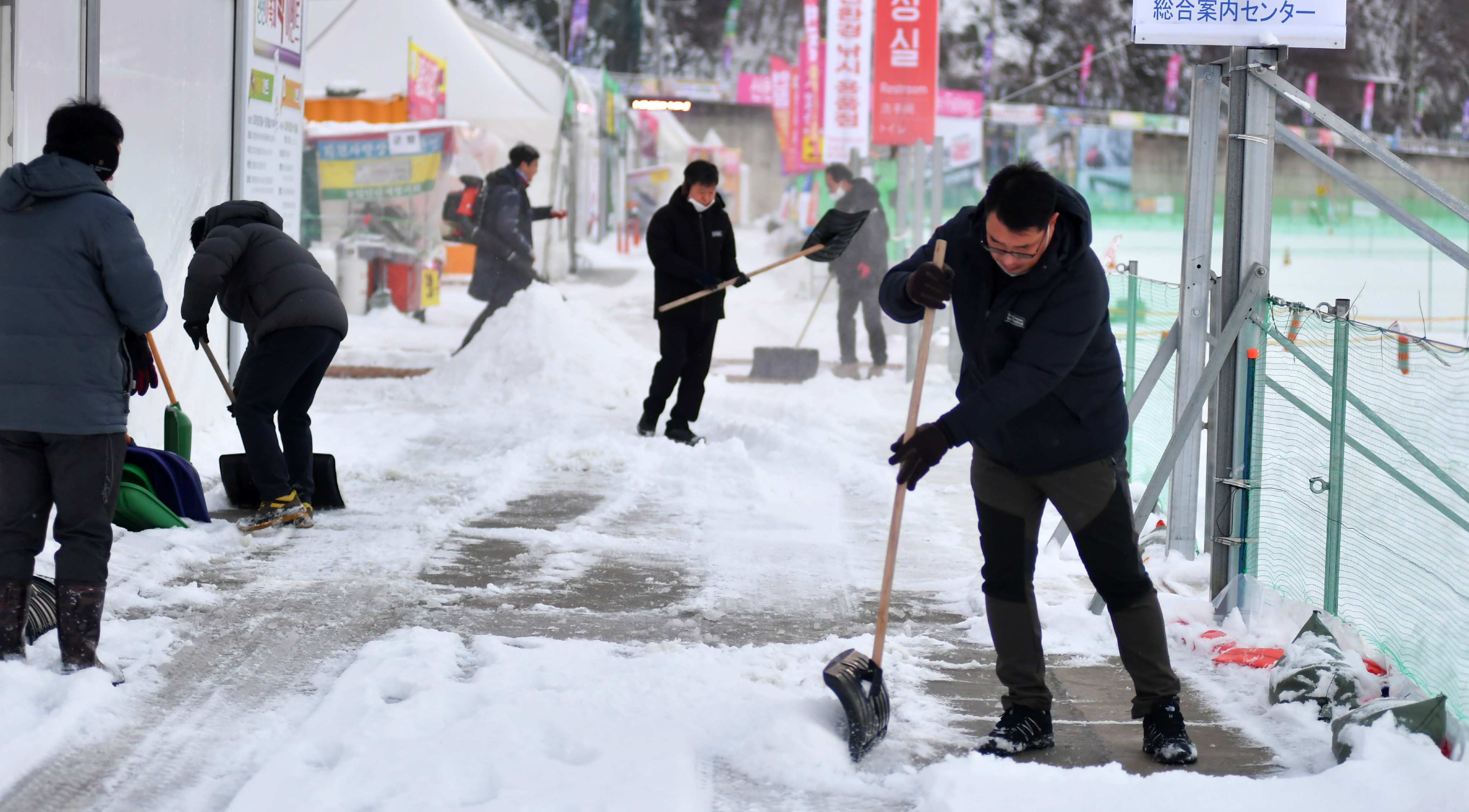 [강원사회복지신문 이정환 기자]=지난 1월 20일 오전 화천산천어축제장에서 화천군청 전 직원들이 관광객 안전과 원활한 프로그램 진행을 위해 전날 밤에 내린 눈 제설작업에 동참했다.