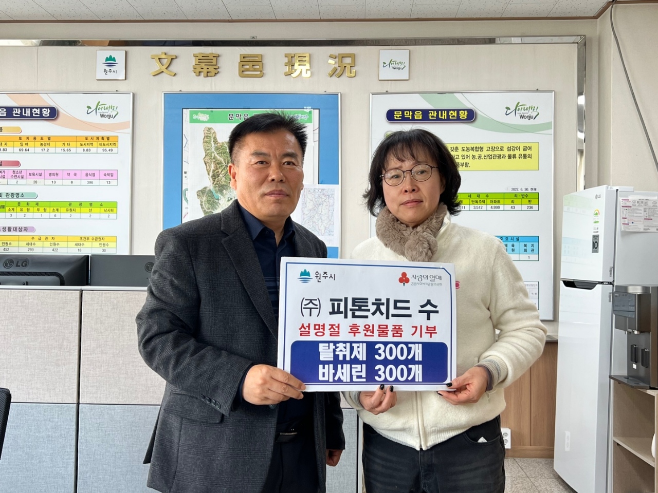[강원사회복지신문 김도연 기자]=원주시 문막 동화리 소재 (주)피톤치드 수(대표 김덕웅)는 지난 1월 19일 설 명절을 맞아 관내 저소득층을 위해 400만 원 상당의 탈취제 300개와 바세린 300개를 문막읍 행정복지센터에 기탁했다. 김덕웅 대표는 "정성을 쏟아 천연재료로 만든 탈취제와 바세린이 어려운 이웃들에게 도움이 되...