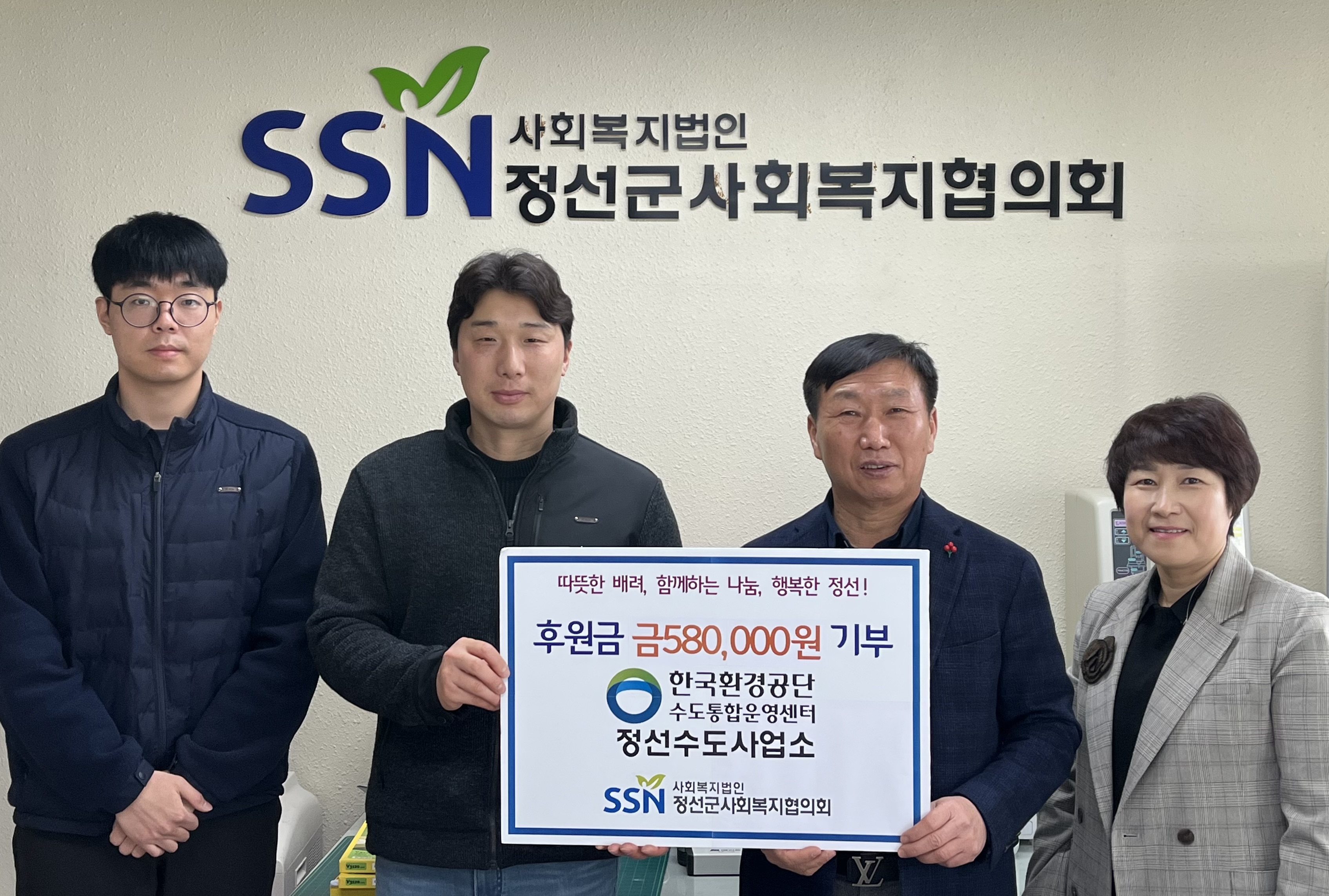[강원사회복지신문 김도연 기자]=한국환경공단 정선수도사업소에서 설 명절을 앞두고 취약가구를 위해 위로금 (금580,000원)을 정선군사회복지협의회에 전달하였다. 민족 최대의 명절인 설을 맞이하여 정선수도사업소 임직원들의 자발적인 성금으로 홀로 명절을 보내실 취약가구 어르신들의 소외감을 경감하고, 평안한 명절을...