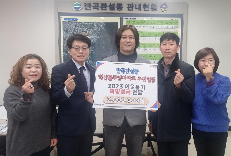 [강원사회복지신문 서은진 기자]=원주시 반곡관설동 벽산블루밍 주민 일동(반곡관설동 22~23통)은 지난 1월 12일 반곡관설동 행정복지센터를 방문해 이웃돕기 성금 200만 원을 전달했다. 김대권 반곡벽산블루밍아파트 입주자 대표회장은 "저소득 가구가 따뜻한 겨울을 보내는 데 조금이나마 도움이 되길 바라는 마음으로 주민...