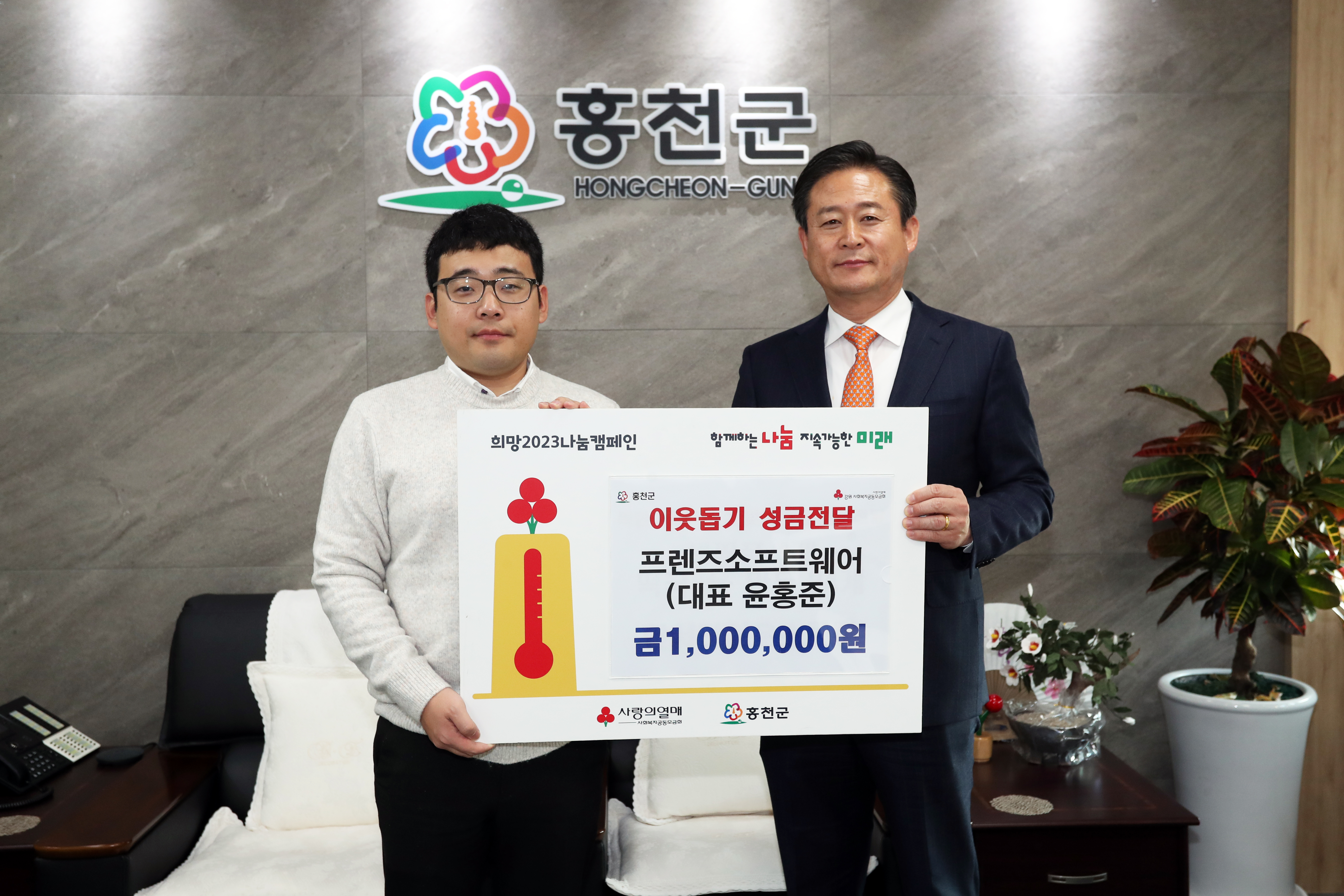 [강원사회복지신문 홍기한 기자]=프렌즈소프트웨어(대표 윤홍준)는 지난 1월 12일 홍천군청을 방문해 '희망2023나눔캠페인' 성금 100만원을 기탁했다. 프렌즈소프트웨어는 올해 1월 홍천군으로 이주했다. 윤홍준 대표는 "2월부터 웹 개발 사업을 새로 시작하기에 앞서 이웃사랑을 실천하기 위해 캠페인에 동참하게 됐다"며, ...