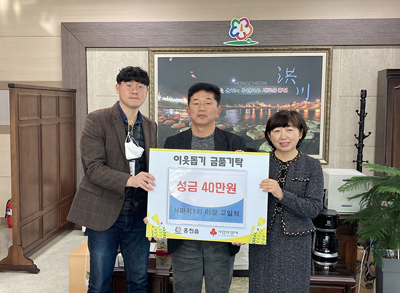 [강원사회복지신문 김도연 기자]=홍천군 홍천읍 삼마치1리 고일혁 이장은 지난 1월 4일 홍천읍행정복지센터를 방문해 어려운 이웃돕기 성금 40만원을 기탁했다. 양지두부촌을 운영하며 매년 나눔을 실천하고 있는 고일혁 이장은"“추운 겨울 소외된 이웃에게 희망을 전하고자 성금을 기부하게 됐다"고 말했다. 심금화 홍천읍...