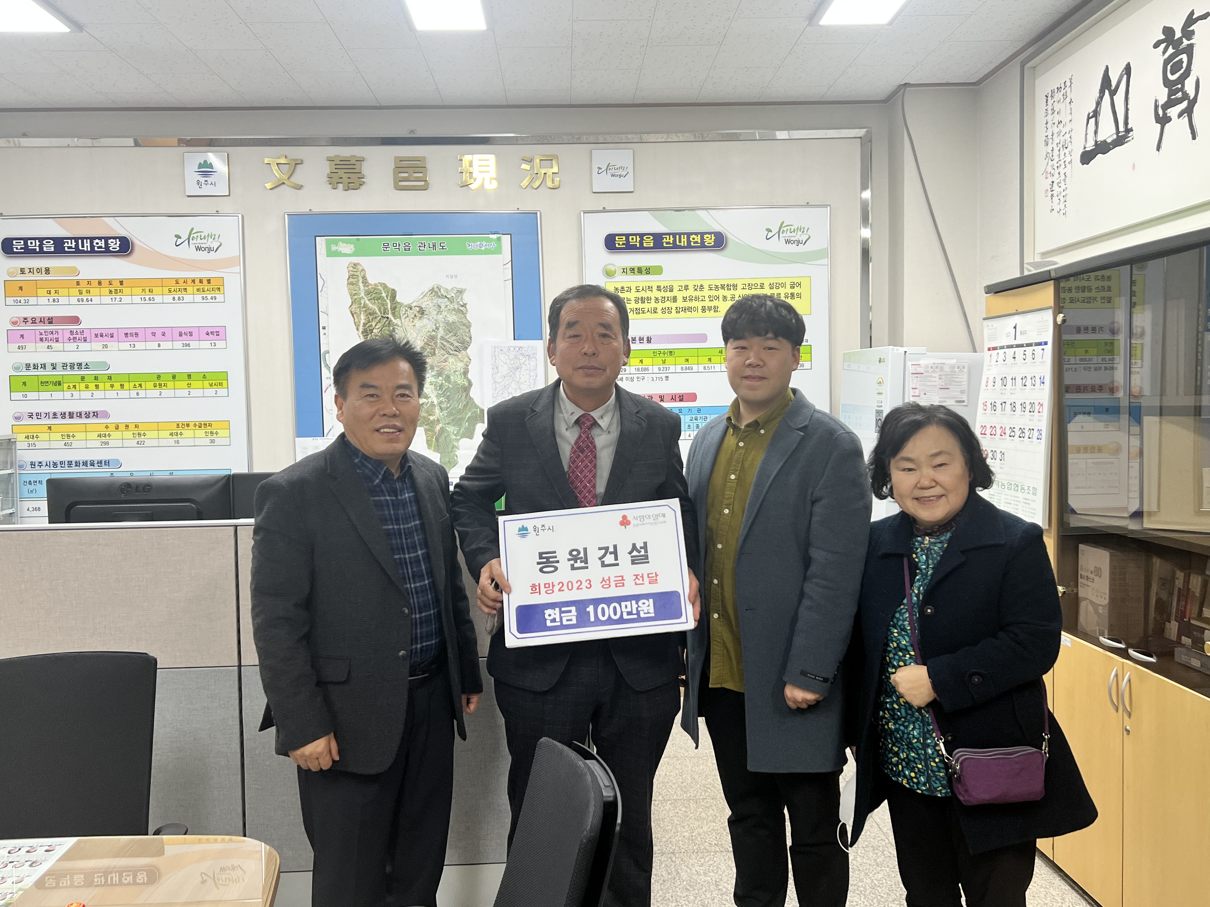 [강원사회복지신문 서은진 기자]=원주시 호저면 소재 동원건설(주)(대표 이성숙)는 지난 1월 3일 원주시 문막읍 행정복지센터를 방문해 희망2023나눔캠페인 성금 100만 원을 기부했다. 성금은 강원사회복지공동모금회를 통해 문막읍지역사회협의체 소외계층 지원 등의 사업에 사용될 예정이다.