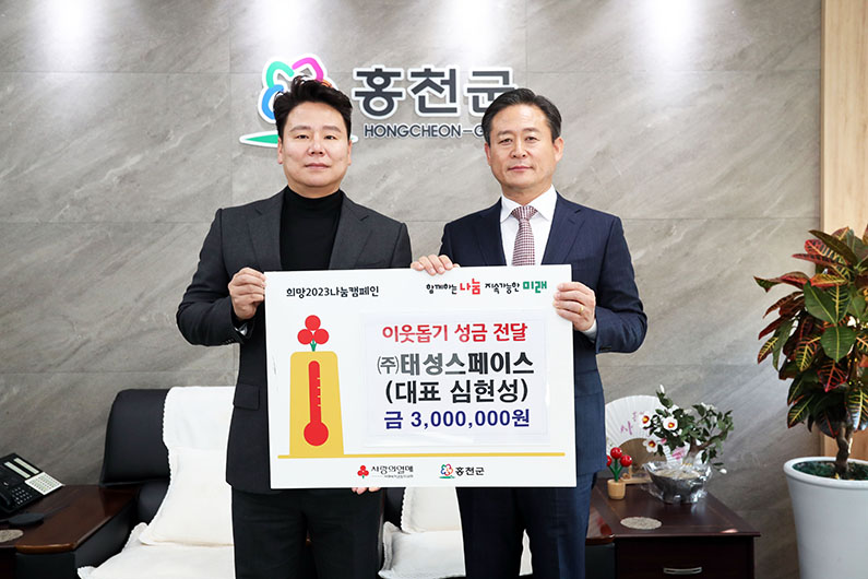[강원사회복지신문 홍기한 기자]=(주)태성스페이스(대표 심현성)는 지난 1월 3일 홍천군청을 방문해 '희망2023나눔캠페인' 성금 300만원을 기탁했다. (주)태성스페이스는 지난해 8월 홍천군 무궁화장학금을 기탁한데 이어 새해를 맞아 어려운 이웃돕기 성금을 쾌척하는 등 나눔을 통한 이웃사랑을 실천하고 있다. 심현성 대표...
