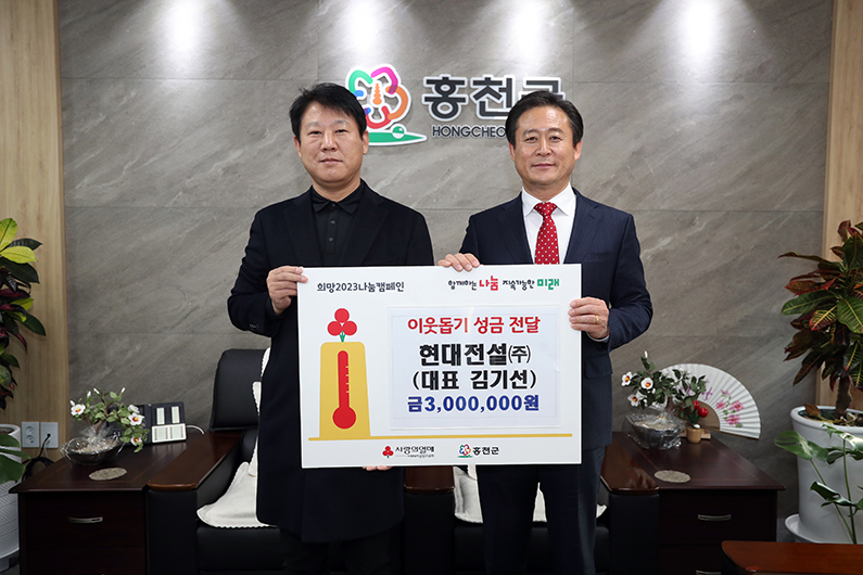[강원사회복지신문 홍기한 기자]=현대전설(주)(대표 김기선)은 지난 12월 30일 홍천군청을 방문해 '희망2023나눔캠페인' 성금 300만원을 기탁했다. 한편 전달된 성금은 강원도 사회복지공동모금회를 통해 도움이 필요한 이웃을 위해 사용될 예정이다.