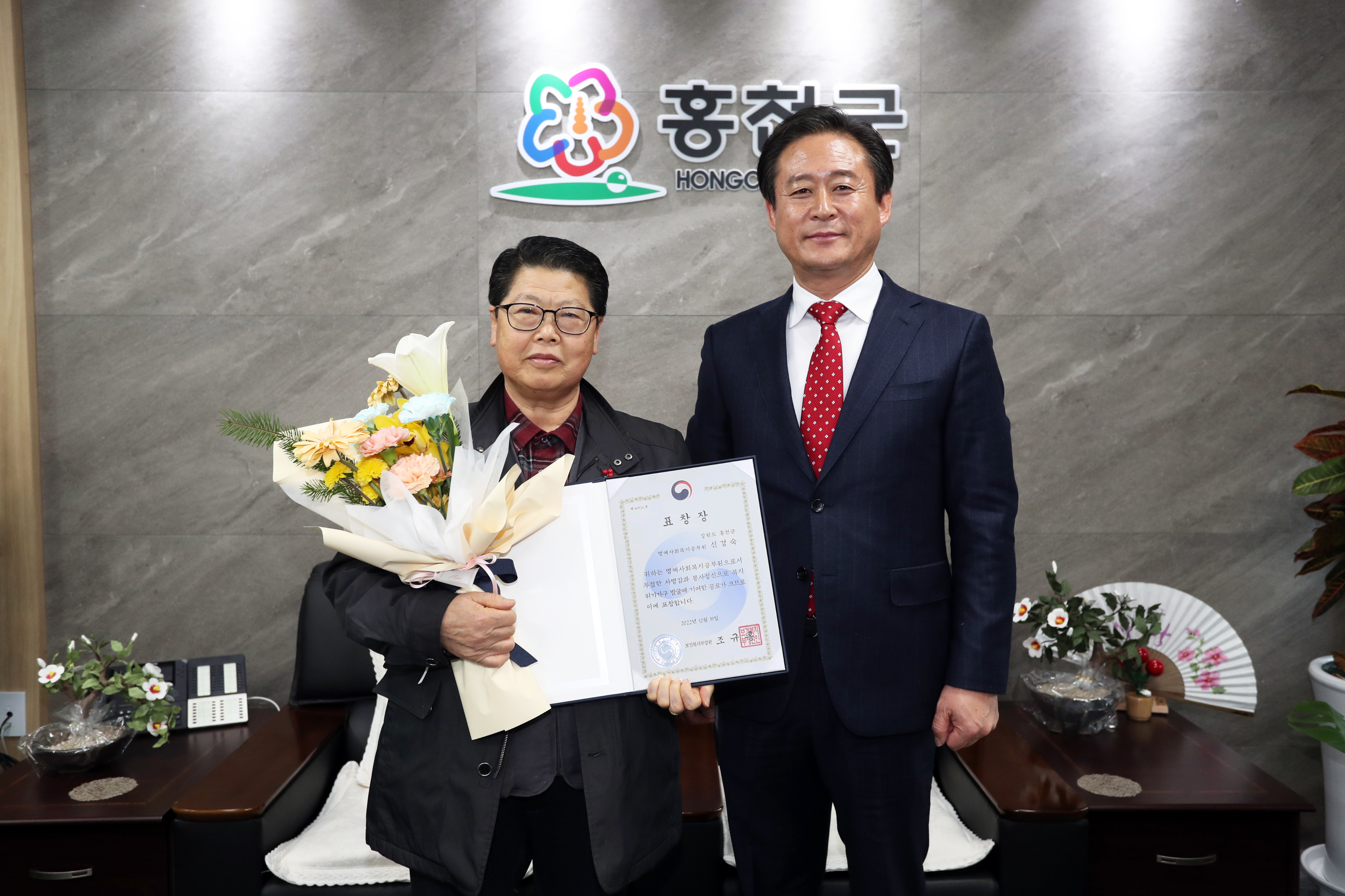 [강원사회복지신문 홍기한 기자]=신영재 홍천군수는 지난 12월 30일 군청 접견실에서 홍천읍 지역사회보장협의체 신경숙 민간위원장에게 2022년 명예사회복지공무원 유공표창을 수여했다. 홍천읍 지역사회보장협의체 신경숙 민간위원장은 신장대2리 및 은혜회 회장 등을 역임하며 32년간 홍천군 사각지대 발굴 및 어려운 이웃...