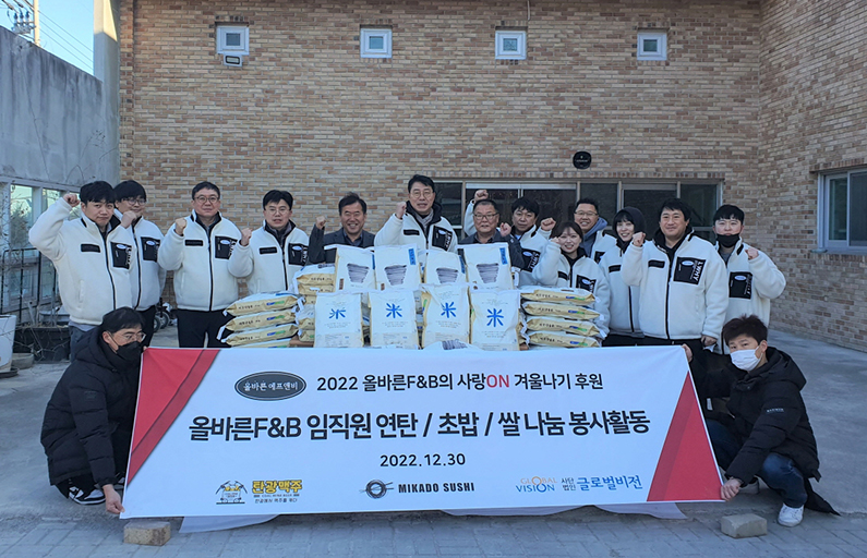 [강원사회복지신문 김도연 기자]=올바른에프앤비는 지난 12월 30일(금) 오전 10시 삼척시 도계읍 흥전지역아동센터에서 도계읍 취약계층 45가구에 난방연료(연탄, 등유)와 쌀 등 2천만 원 상당의 물품을 전달하였다. 이번 지원은 취약계층 45가구에 연탄 9,000장, 등유 2,625리터를 지원하고 쌀 1,000kg 및 초밥 중식을 지원...