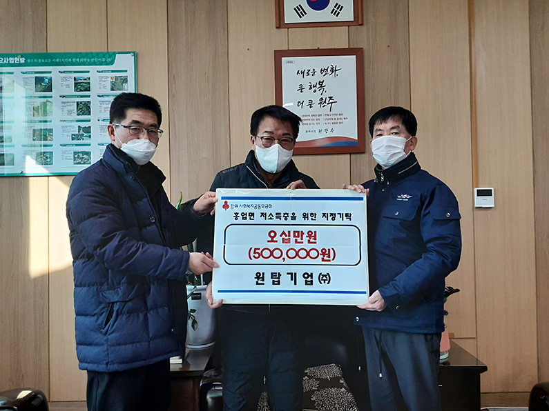 [강원사회복지신문 홍기한 기자]=원탑기업(주)(대표 이석중, 이호길)은 지난 12월 29일 원주시 흥업면 행정복지센터를 찾아 희망2023나눔캠페인 이웃돕기성금 50만 원을 지정기탁했다. 이석중 대표는 "큰 금액은 아니지만 코로나19로 힘든 시기를 극복할 수 있도록 성금을 어려운 이웃을 돕는데 써달라."며 겸손한 마음을 전...
