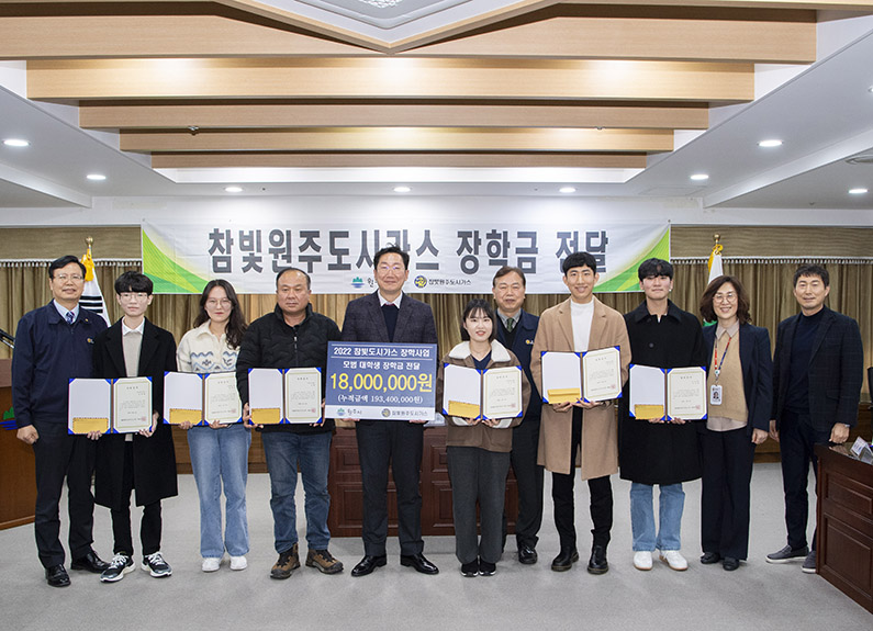 [강원사회복지신문 서은진 기자]=참빛원주도시가스(주)(회장 이대봉)는 지난 12월 29일 원주시청 투자상담실에서 원주시에서 추천을 받은 대학생 6명에게 1인당 300만 원씩 총 1,800만 원의 장학금을 전달했다. 참빛그룹 산하 참빛원주도시가스(주)는 지역의 우수인재 육성을 위해 지난 2008년부터 원주시의 추천을 받아 매년...