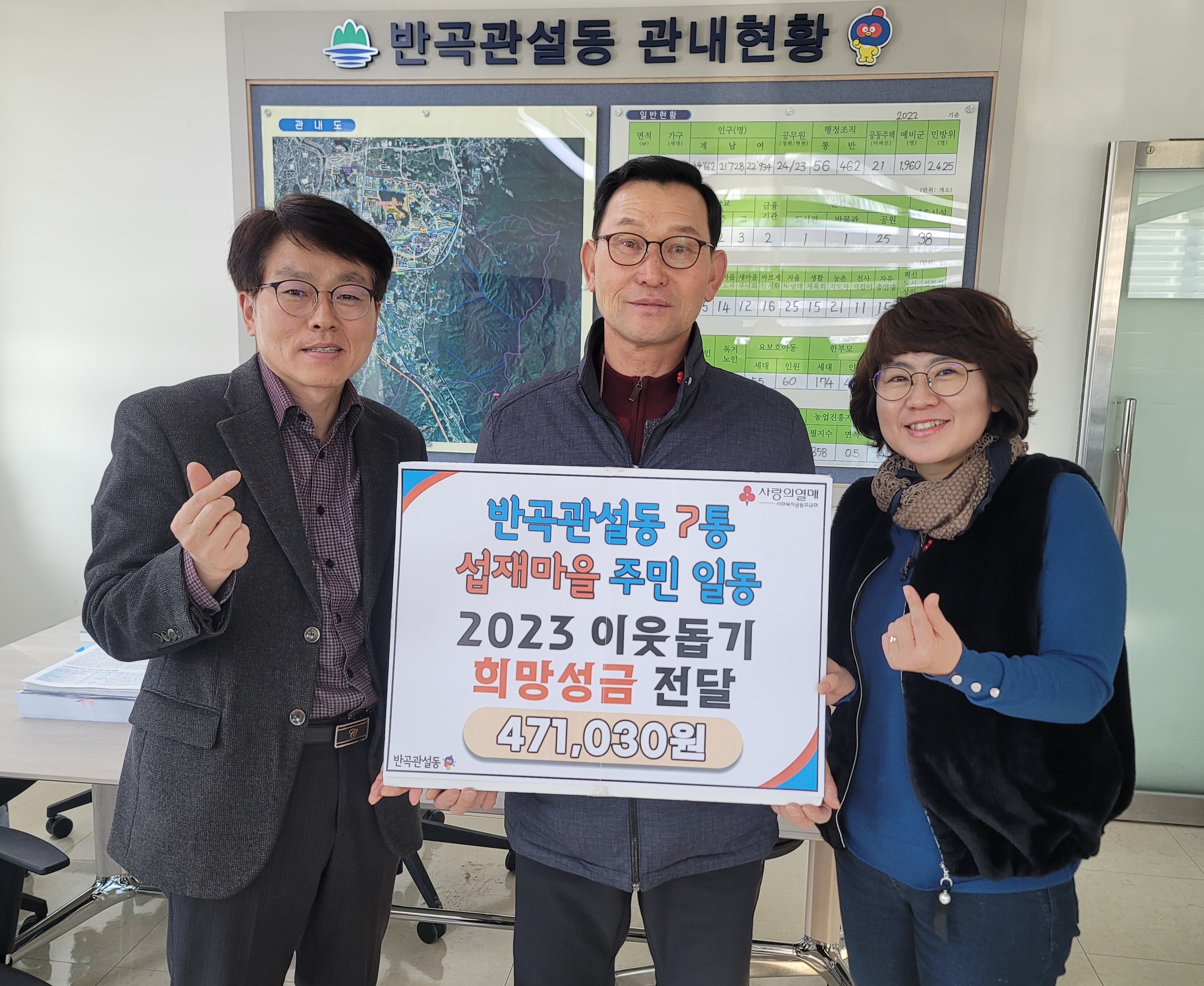 [강원사회복지신문 홍기한 기자]=원주시 반곡관설동 7통(통장 강인식) 섭재마을 주민 일동은 지난 12월 19일 반곡관설동 행정복지센터를 방문해 이웃돕기 성금 47만 원을 전달했다. 강인식 통장은 "저소득 가구가 따뜻한 겨울을 보내는 데 조금이나마 도움이 되기를 바라는 마음으로 섭재마을 주민들이 힘을 모아 후원하게 됐...