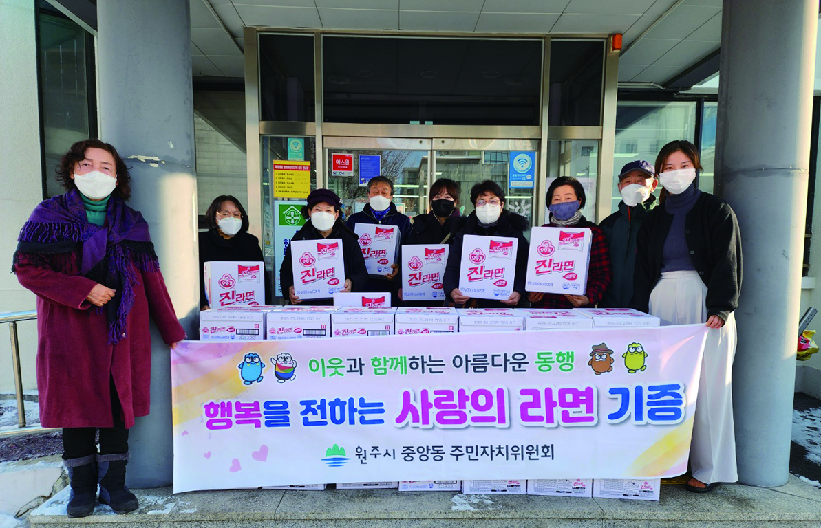 [강원사회복지신문 김도연 기자]=원주시 중앙동 주민자치위원회는 지난 12월 16일 사랑의 라면 70박스를 중앙동 행정복지센터에 기증했다. 이날 회원들은 주민자치위원회 일일찻집 수익금으로 마련된 사랑의 라면을 관내 소외계층 70가구에 전달했다. 황승룡 주민자치위원장은 "우리 이웃이 정성껏 기증한 라면을 맛있게 드시...