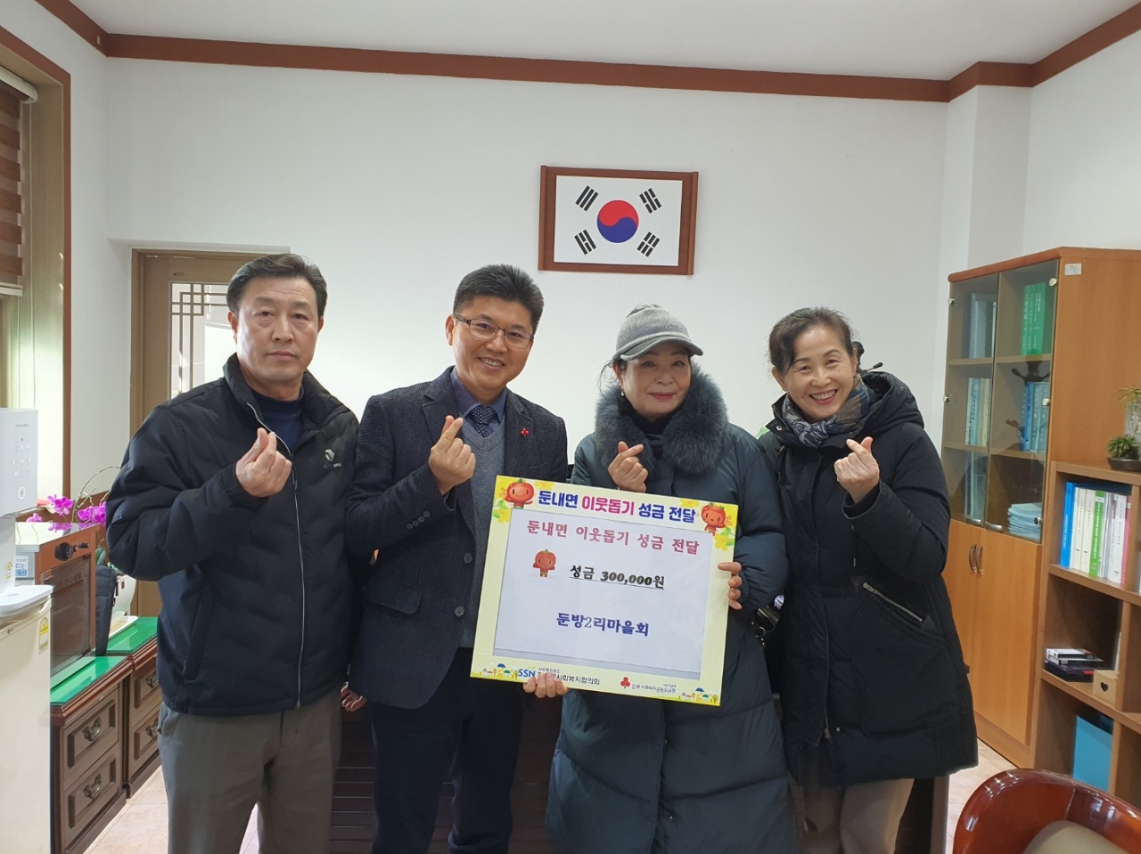 [강원사회복지신문 서은진 기자]=횡성군 둔내면 둔방2리마을회(이장 박옥분)은 지난 12월 19일 연말을 맞아 경제적으로 어려운 시기를 보내고 있는 관내 저소득 이웃을 돕는데 사용해 달라며 둔내면(면장 최동섭)에 현금 30만원을 기탁했다.