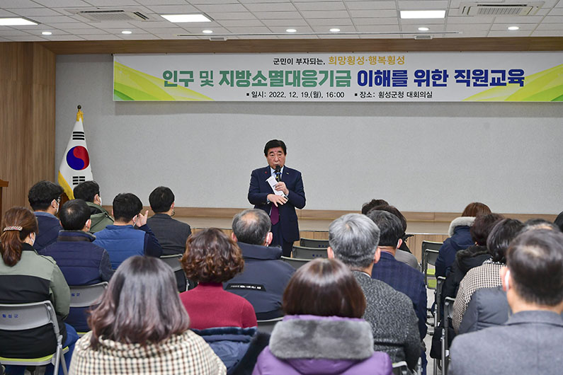 [강원사회복지신문 홍기한 기자]=인구 및 지방소멸대응기금 이해를 위한 직원교육 실시 횡성군은 지난 12월 19일, 군청 대회의실에서 2024 지방소멸대응기금 사업발굴과 생활인구 유입방안을 모색하기 위한 첫 출발로 횡성군 실·과·소 팀장 90명을 대상으로 '인구 및 지방소멸대응기금 이해를 위한 직원교육'을 실시했다고...
