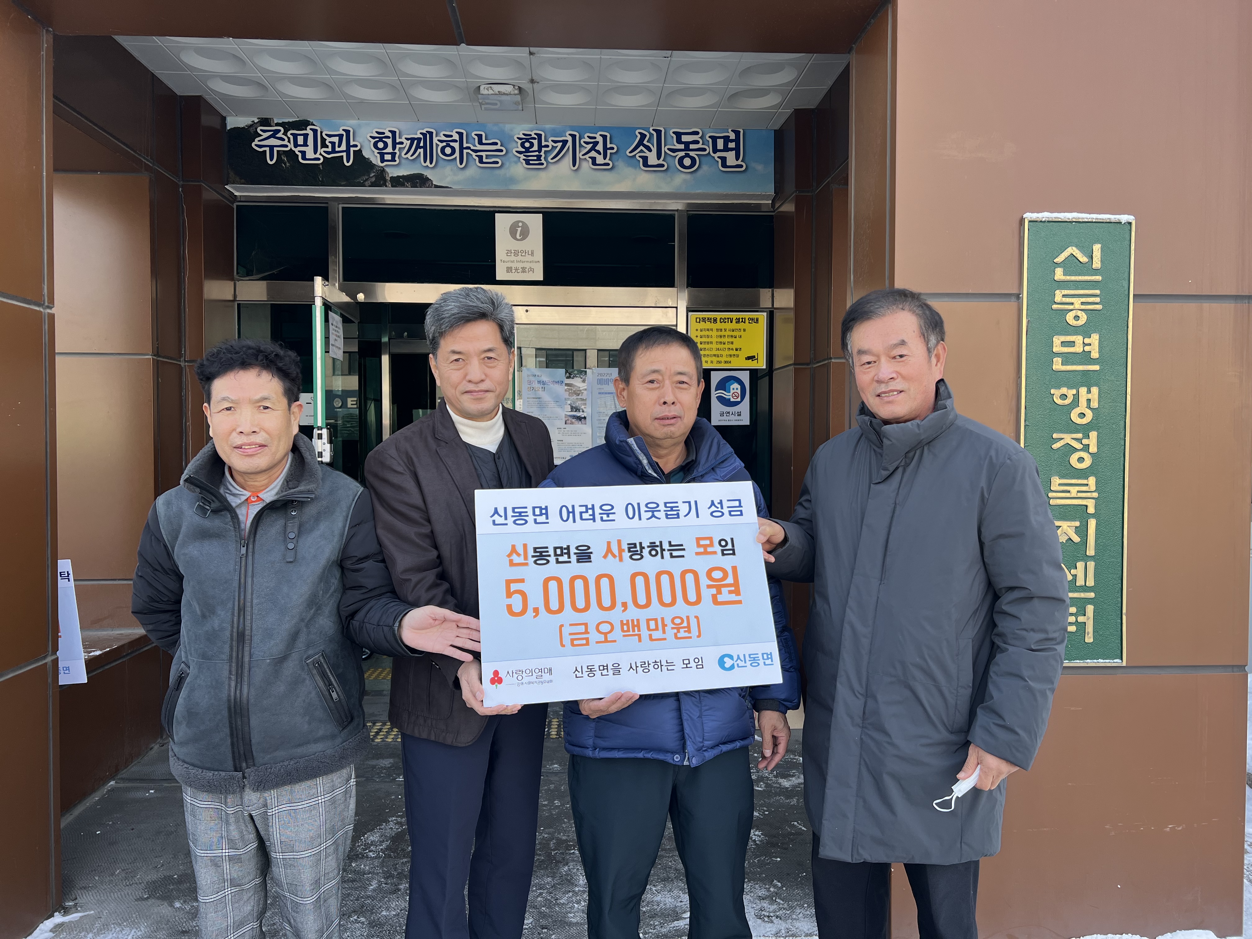 [강원사회복지신문 서은진 기자]=춘천시 신동면 봉사단체 신사모(신동면을 사랑하는 모임 / 회장 김재익)는 지난 12월 16일 신동면 행정복지센터를 찾아 '춘천(春1000)인 천원나눔'의 일환으로 500만원을 전달했다.