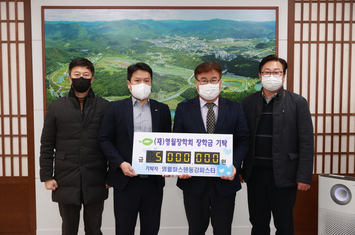 [강원사회복지신문 이정환 기자]=영월탑스텐동강씨스타(대표 정환오)에서는 지난 12월 15일 영월지역 인재육성을 위해 장학금으로 쓰이길 바란다며 5백만원을 재단법인 영월장학회(이사장 최명서)에 기탁하였다.