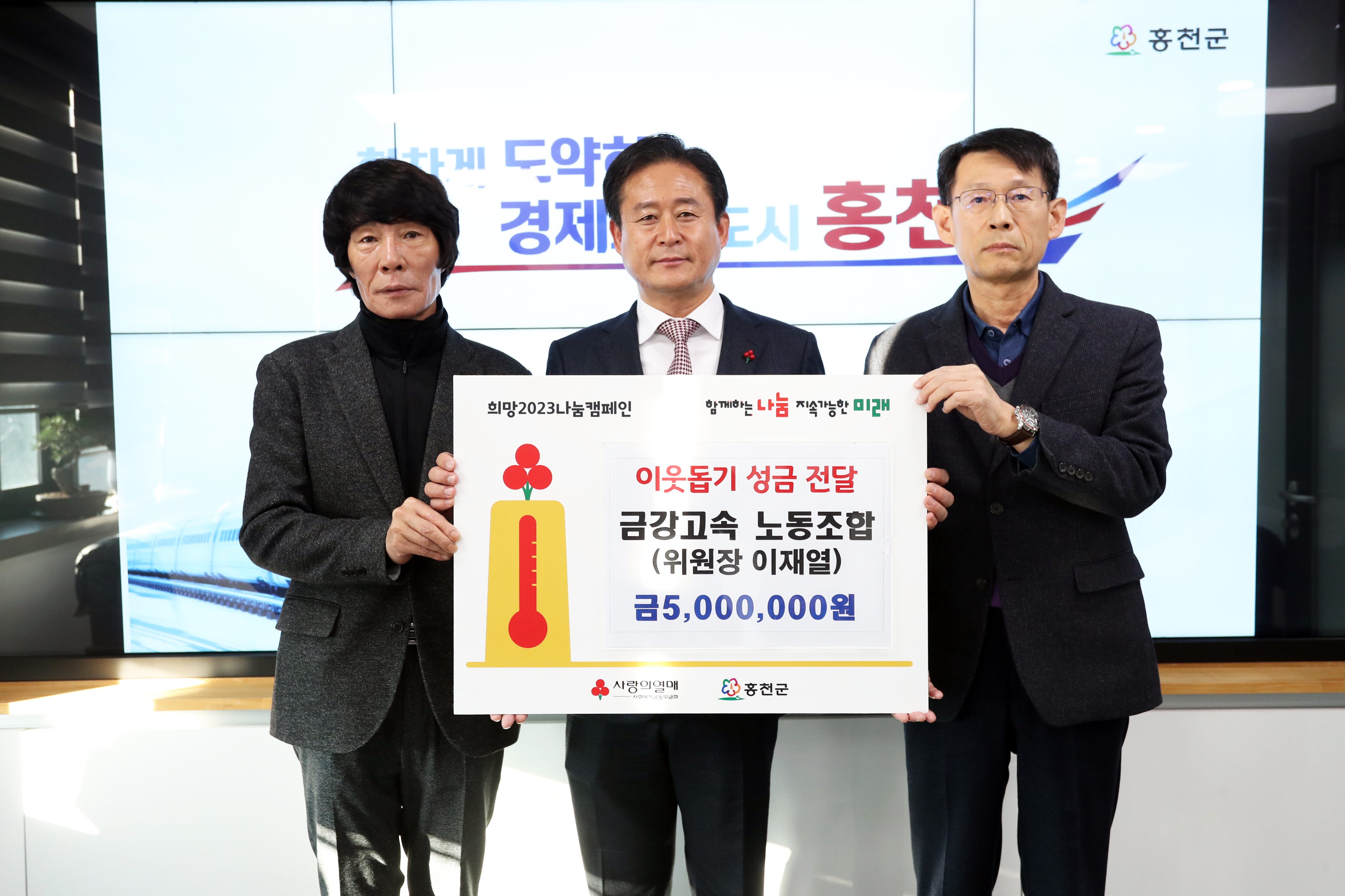 [강원사회복지신문 홍기한 기자]=금강고속 노동조합(위원장 이재열)은 지난 12월 8일 홍천군청을 방문, '희망2023나눔캠페인' 이웃돕기 성금 500만원을 기탁했다. 이재열 위원장은 "연말을 맞아 조합원들과 매달 모은 성금으로 어려운 이웃을 돕고 싶었다"고 말했다. 신영재 홍천군수는 "이웃에 대한 세심한 배려와 관심으로...