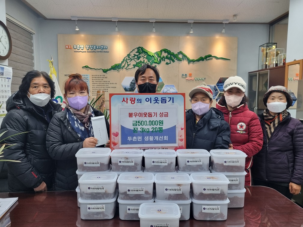 [강원사회복지신문 홍기한 기자]=홍천군 두촌면 생활개선회(회장 설미숙)는 지난 12월 8일 두촌면행정복지센터를 방문, 관내 불우이웃을 위해 성금 50만원과 막장(3kg) 20통을 기부했다. 이날 전달된 성금과 막장은 저소득층 및 독거노인들에게 전달될 예정이다. 장용기 두촌면장은 "이웃사랑을 실천해주신 생활개선회 회원 ...