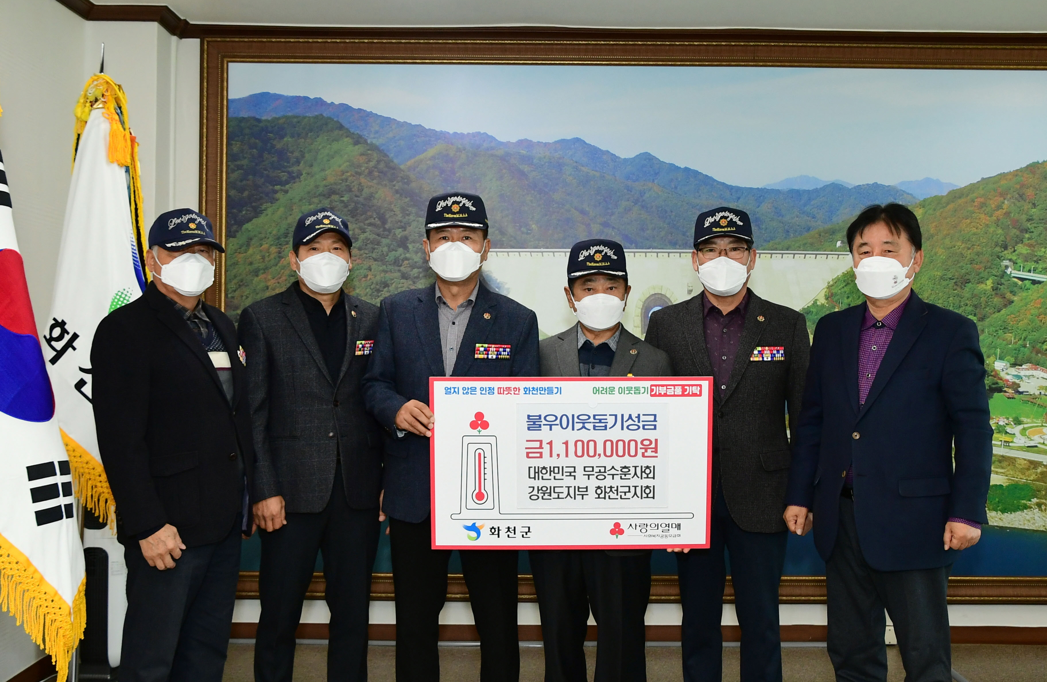 [강원사회복지신문 이정환 기자]=대한민국 무공수훈자회 강원도지부 화천군지회는 지난 11월 30일 최문순 화천군수를 방문해 이웃돕기 성금 110만원을 기탁했다.