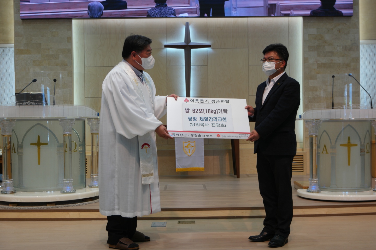 [강원사회복지신문 홍기한 기자]=평창제일감리교회(담임목사 진광호)에서 지난 11월 22일 관내 어려운 이웃을 위해 사용해달라며 10kg 쌀 62포(186만원 상당)를 평창읍사무소에 기탁하였다.