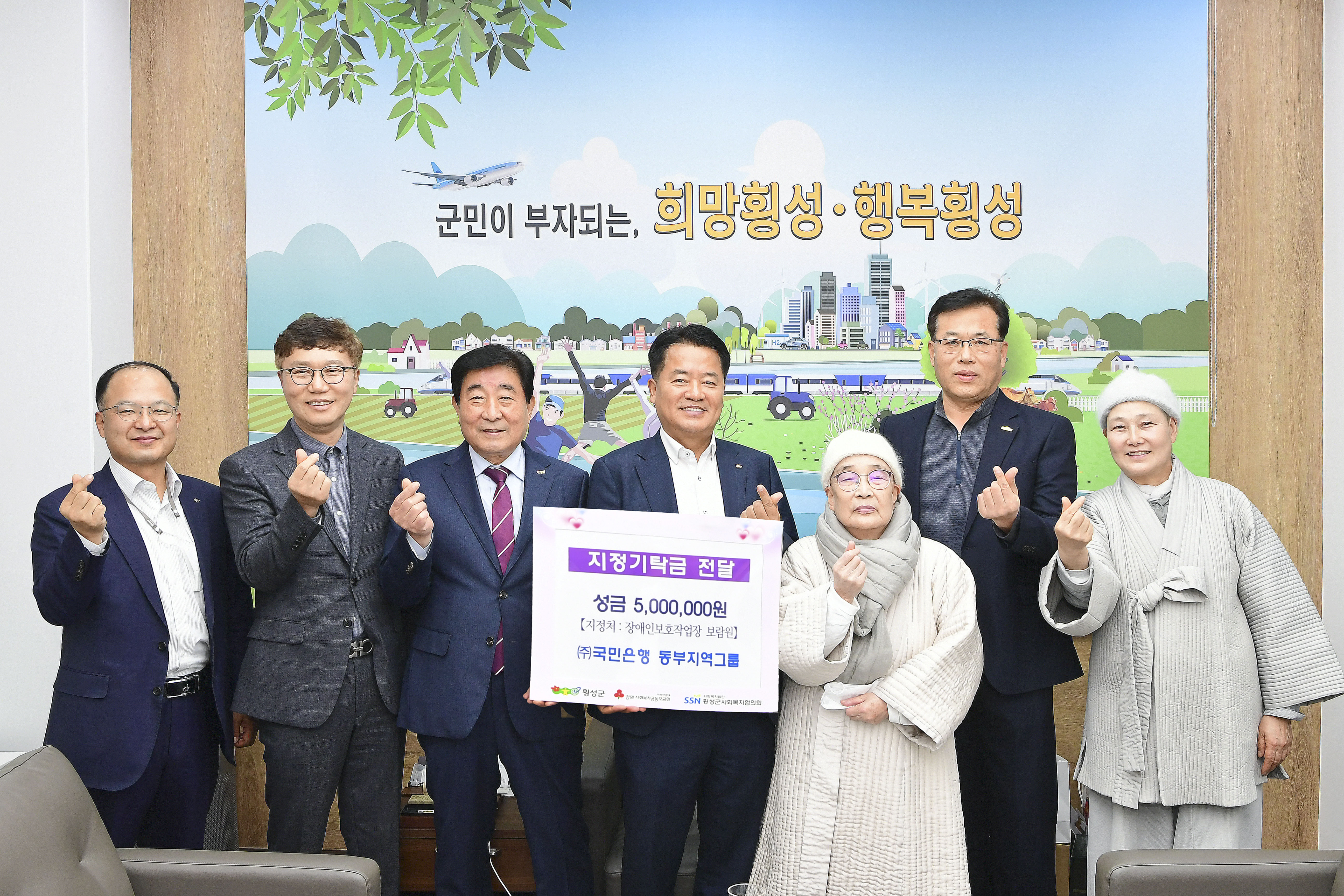 [강원사회복지신문 홍기한 기자]=(주)국민은행 동부지역그룹(대표 강화구)은 지난 11월 15일 오후 3시, 횡성군청을 방문하여 성금 500만원을 장애인보호작업장 보람원(원장 이병국)에 지정기탁하였다. (주)국민은행 동부지역그룹은 2021년 4월과 2022년 6월 두차례 횡성군 장애인 보호작업장 한우리에 500만원 지정기탁하였고...