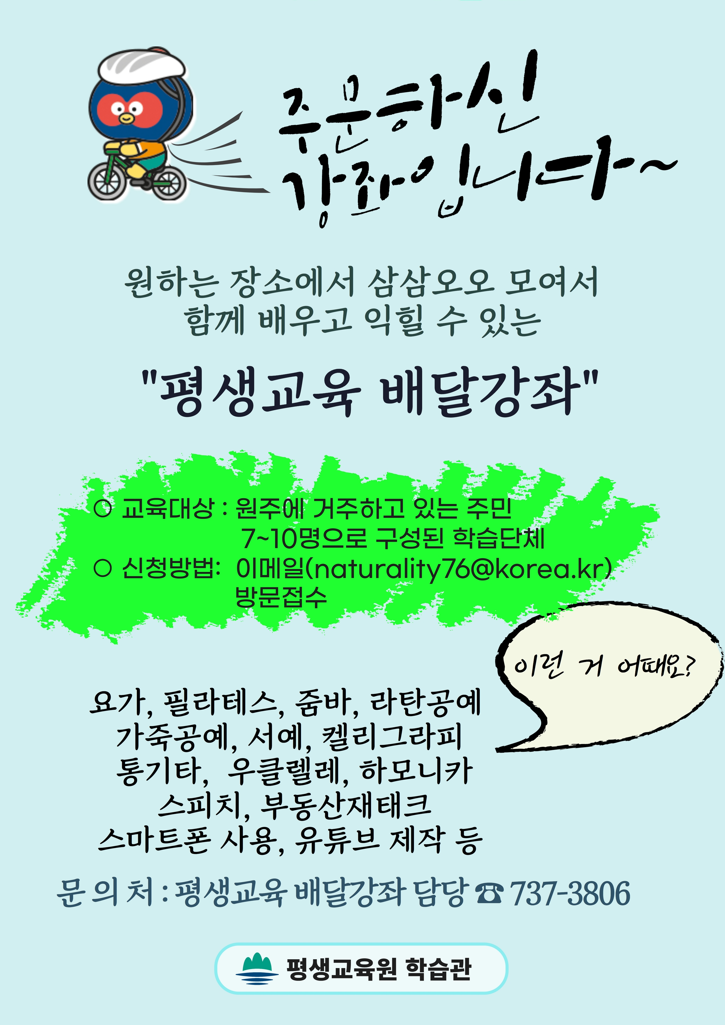 [강원사회복지신문 김도연 기자]=오는 11월 23일까지 6개 강좌 60명 모집, 이메일 또는 팩스로 신청 원주시 평생교육원 학습관(관장 한종태)은 2022년 산업단지 근로자를 위한 배달강좌 수강생을 모집한다. 배달강좌는 시민이 7~10인 이내 학습단체를 구성해 원하는 강좌와 장소를 신청하면 강사가 직접 방문해 강좌를 진행하...