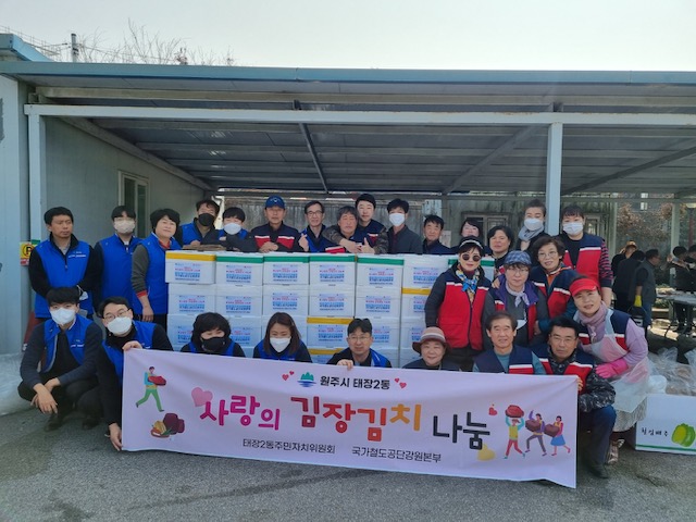 [강원사회복지신문 홍기한 기자]=원주시 태장2동 주민자치위원회(위원장 이강모)와 국가철도공단 강원본부(본부장 양인동)는 지난 11월 10일 정성스럽게 담근 김장김치를 기초수급 독거노인 등 취약계층 80가구에 전달했다. 국가철도공단 강원본부는 2014년부터 명절마다 소외계층을 위한 식품 등 위문품을 마련해 직접 전달...