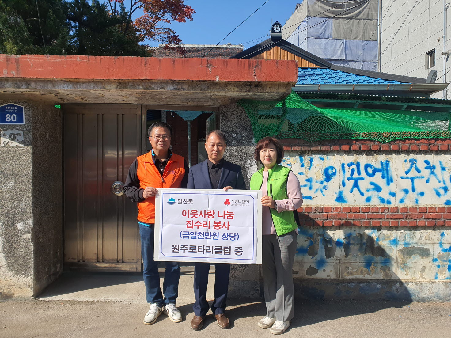 [강원사회복지신문 서은진 기자]=원주로타리클럽(회장 정요한)은 지난 10월 17일부터 약 2주간 일산동 관내 저소득 가구를 대상으로 이웃 사랑 나눔 집수리 봉사활동을 실시했다. 이번 봉사활동에는 회원 20여 명이 참여해 관내 취약계층 중 주거환경이 열악한 2가구를 대상으로 전기공사, 마당 포장공사, 처마 보수공사, 노...