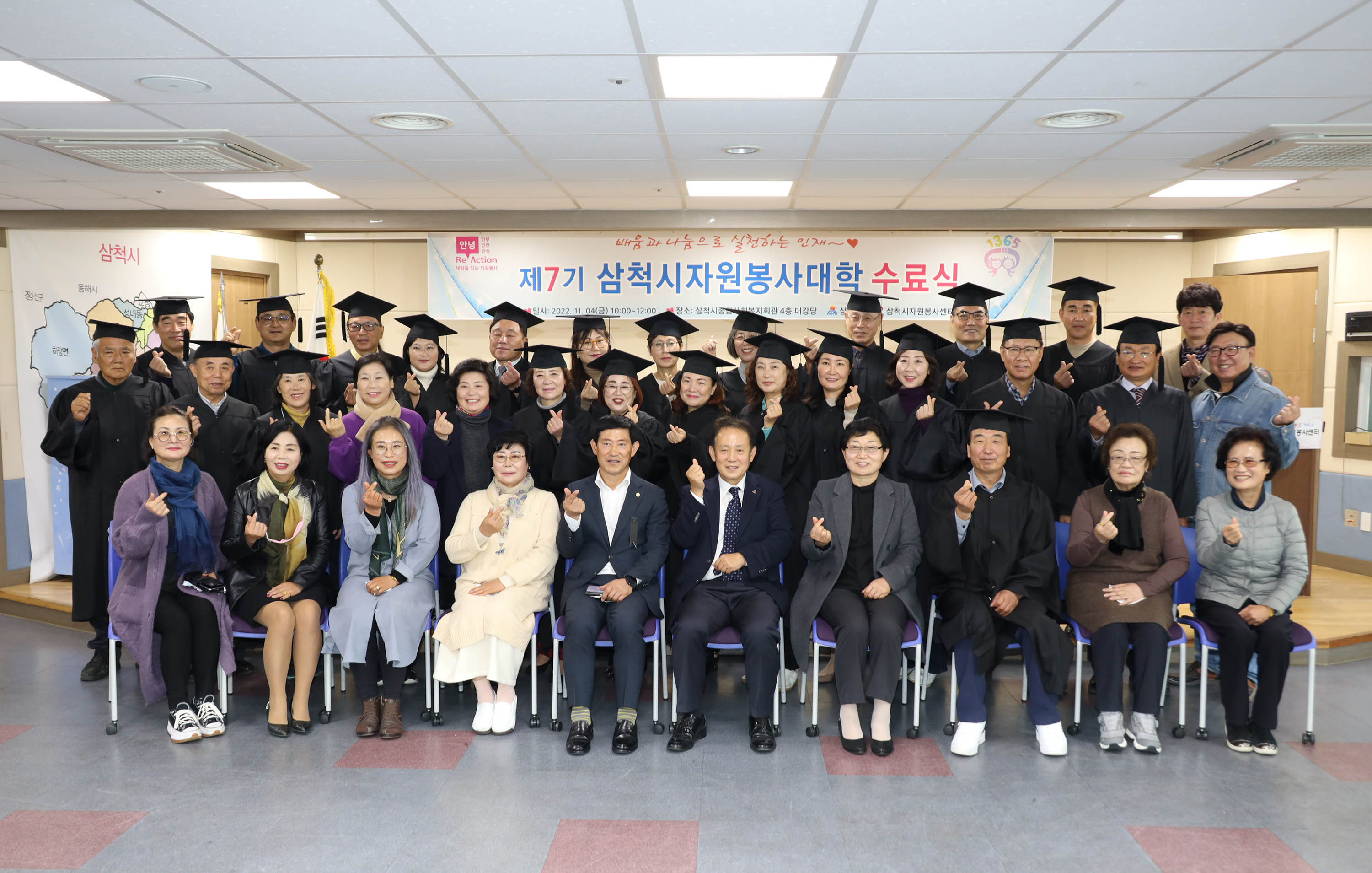 [강원사회복지신문 김도연 기자]=삼척시자원봉사센터(센터장 정영옥)는 지난 11월 4일 오전 10시 30분, 삼척시종합사회복지관 대강당에서 '제7기 삼척시자원봉사대학' 수강생 24명을 대상으로 수료식을 개최하였다. 이번 행사는 정영옥 센터장의 수료식사를 시작으로 박상수 삼척시장을 대신하여 참석한 박원희 삼척시 자치행...