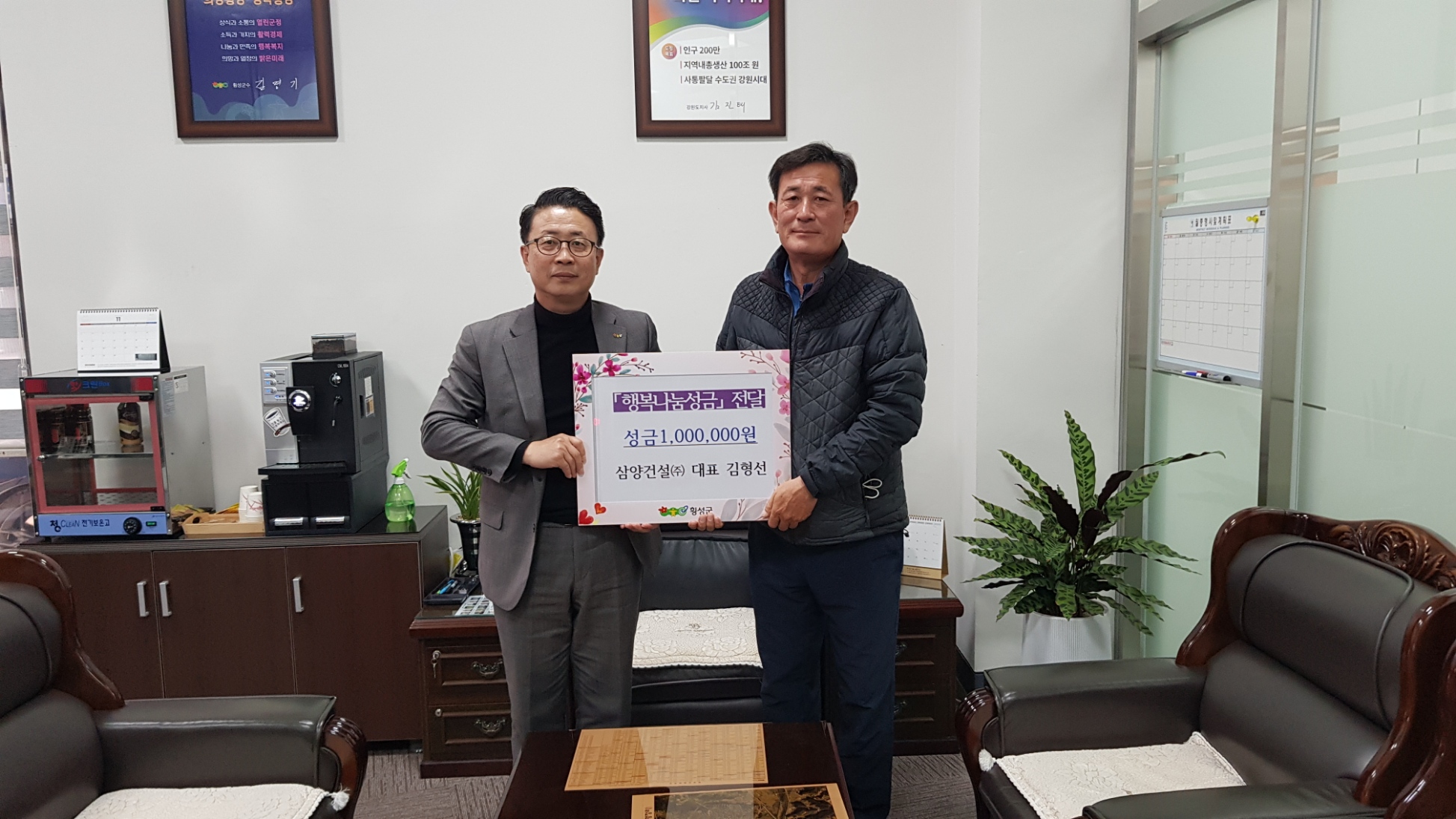 [강원사회복지신문 홍기한 기자]=김형선 삼양건설 대표(횡성누리스타봉사단장)가 지난 11월 4일, 횡성읍 행정복지센터에 방문하여 동절기 어려운 이웃을 위해 써달라며 성금 100만원을 기탁하였다. 김형선 대표는 "자원봉사단체를 이끌어 오면서 관내 저소득층 가정의 집수리 봉사 등 다양한 봉사활동을 통해 그분들의 어려움...