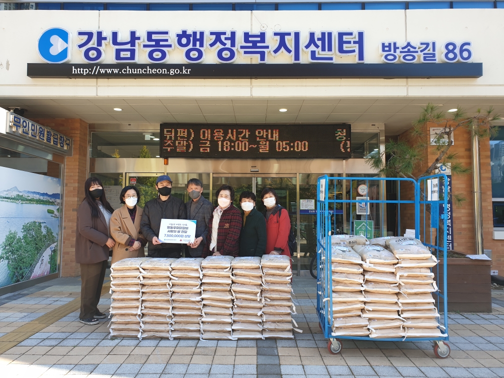 [강원사회복지신문 서은진 기자]=춘천 명동우미닭갈비(대표 : 장홍근)는 지난 10월 19일 춘천시 강남동 소외계층을 위해 쌀10kg 300포(750만원 상당)를 강남동행정복지센터에 후원했다.