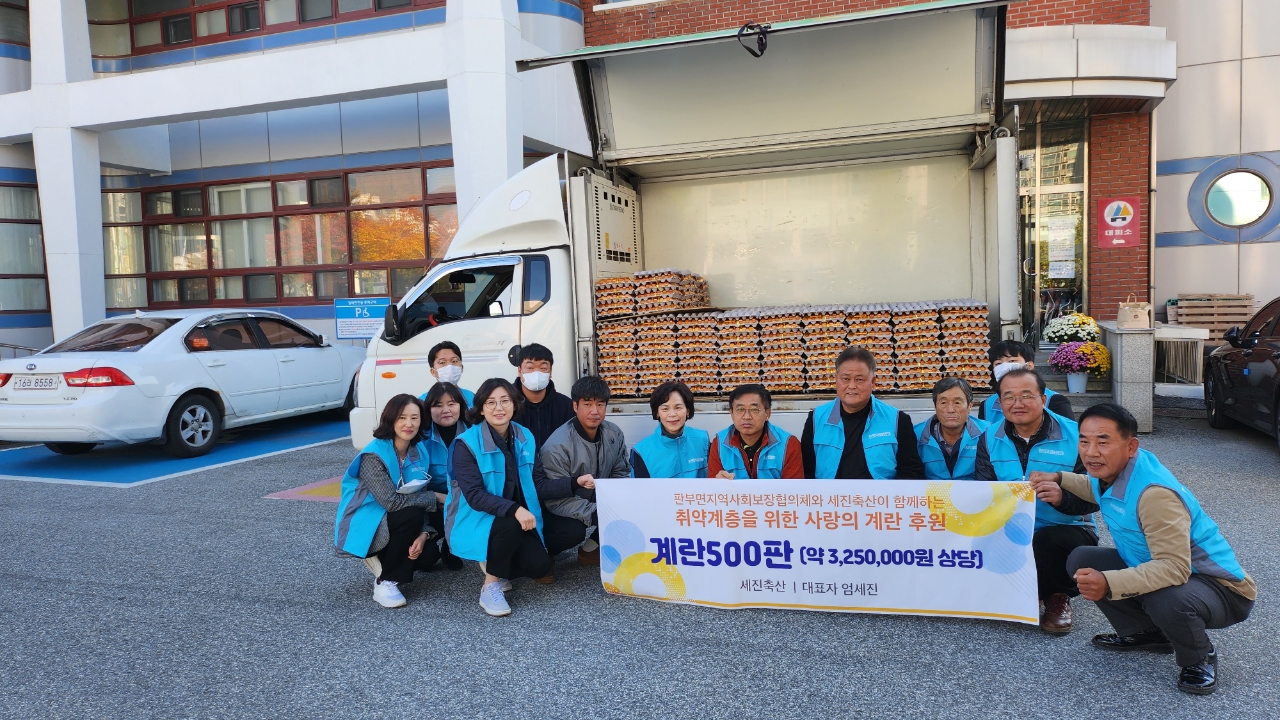 [강원사회복지신문 서은진 기자]=세진축산(대표 엄세진)은 지난 10월 19일 325만 원 상당의 계란 500판을 원주시 판부면 행정복지센터에 전달했다. 이번에 후원받은 계란은 판부면지역사회보장협의체(위원장 박영학)를 통해 코로나19로 생활이 더욱 어려워진 관내 저소득층에게 전달될 예정이다. 엄세진 대표는 "코로나19로 ...