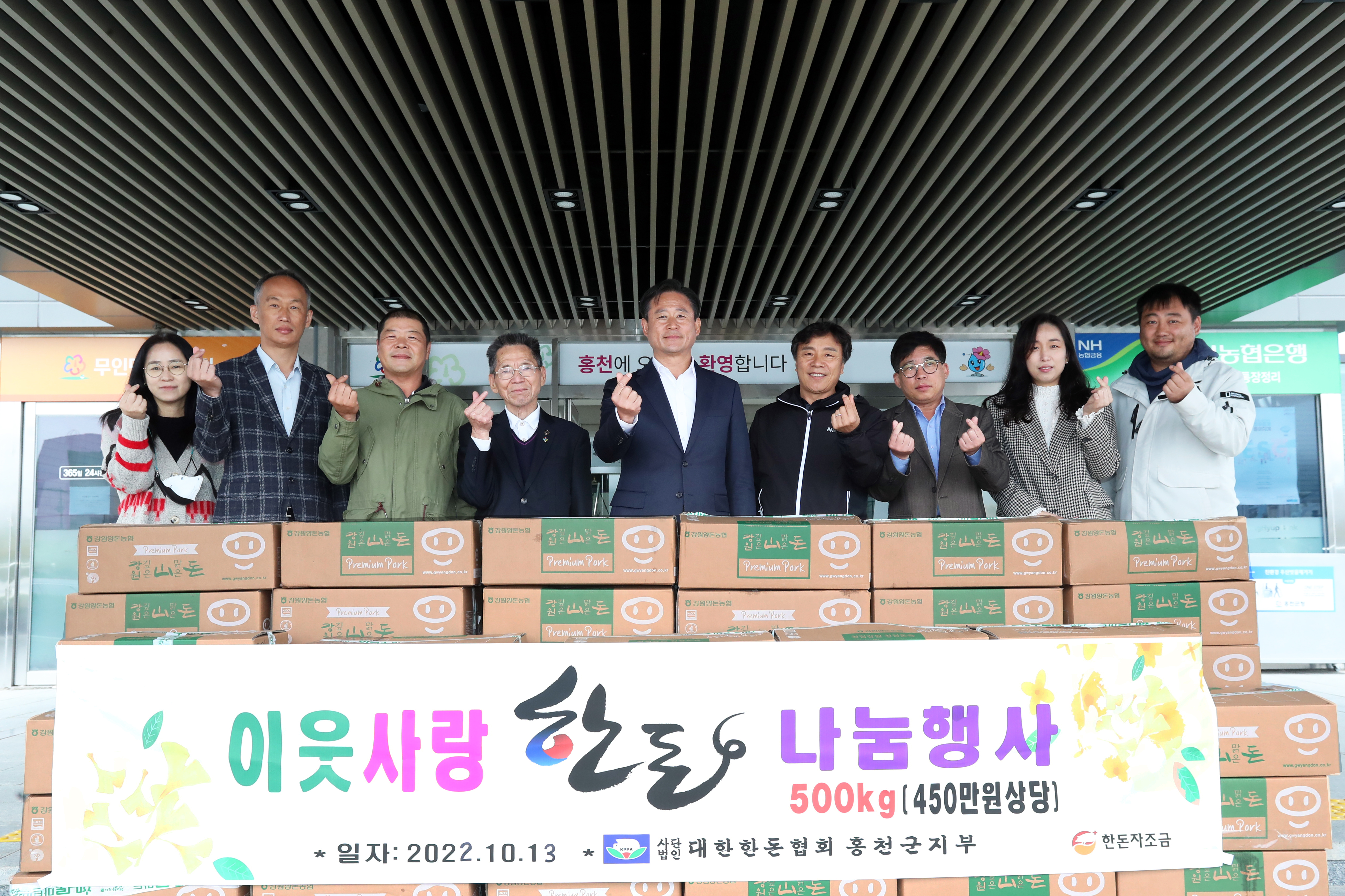 [강원사회복지신문 홍기한 기자]=(사)대한한돈협회 홍천지부(대표 심윤보)는 지난 10월 13일 홍천군청을 방문하여, 어려운 이웃돕기 후원물품을 전달했다. 후원물품은 전지 슬라이스(2kg) 262팩으로 지역 내 저소득층 및 독거노인 가구에 전달될 예정이다. (사)대한한돈협회 홍천지부는 취약계층에게 꾸준한 나눔을 실천하고...