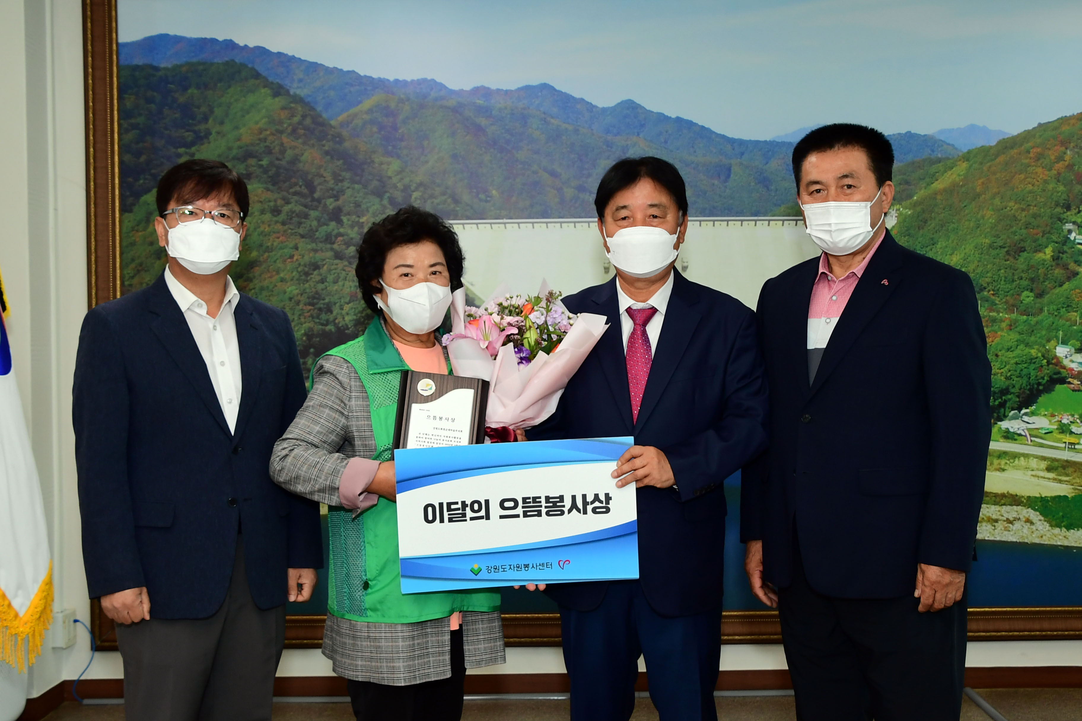 [강원사회복지신문 서은진 기자]=강원도 자원봉사센터 '이달의 으뜸 봉사상' 시상식이 지난 10월 11일 화천군청에서 최문순 군수와 수상자인 김경이 군새마을부녀회장, 김영수 군자원봉사센터장 등이 참석한 가운데 열렸다.