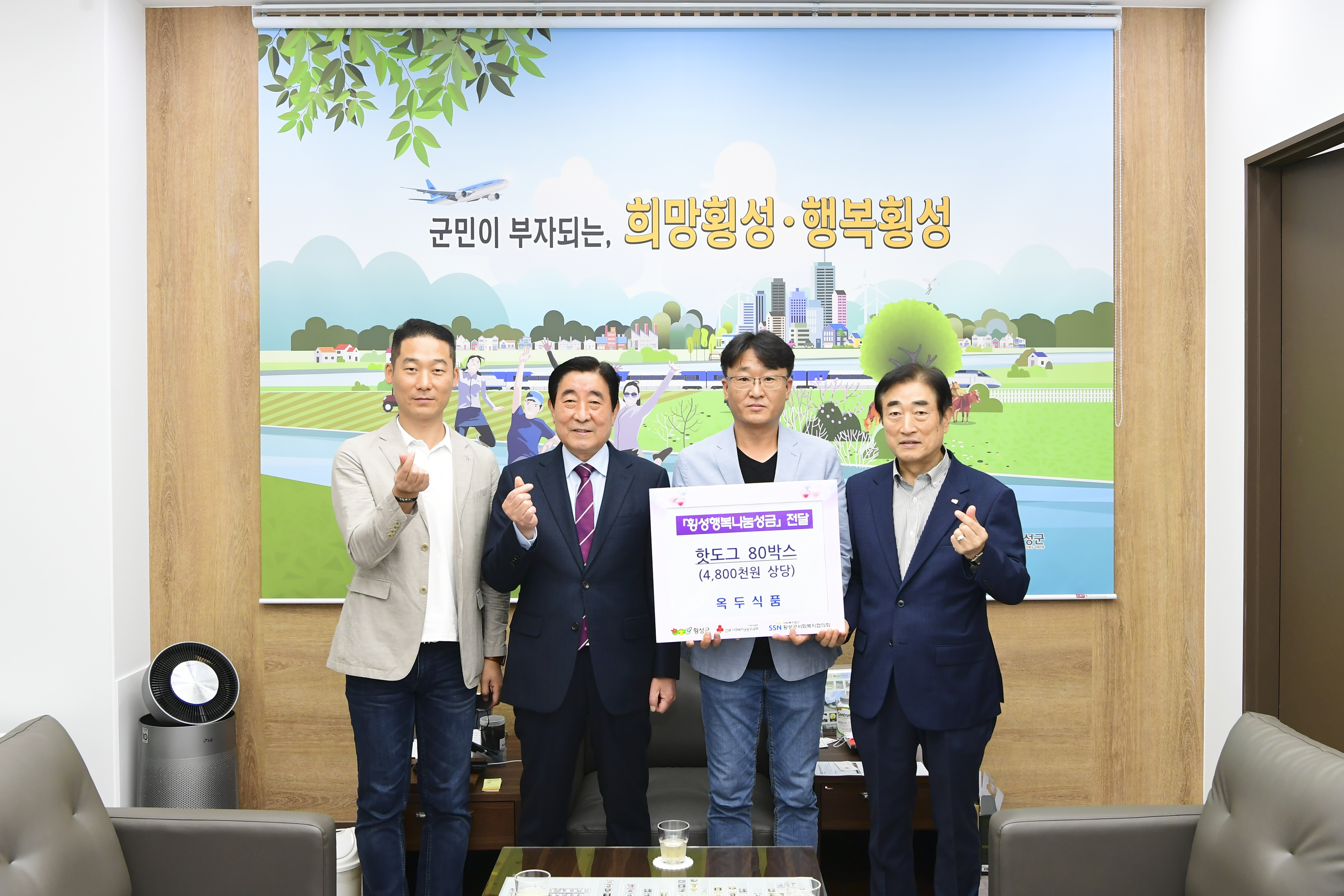[강원사회복지신문 이정환 기자]=옥두식품(대표 최광석)은 지난 10월 6일, 오전 10시 30분 군수집무실을 방문하여 냉동핫도그 80박스(4,000개, 4,800천원 상당)를 '횡성행복나눔성금'에 기탁하였다. 이날 전달식에 김명기 군수와 최광석 옥두식품 대표, 이석원 횡성군사회복지협의회장이 참석하였다. 옥두식품은 2021년 5월에...