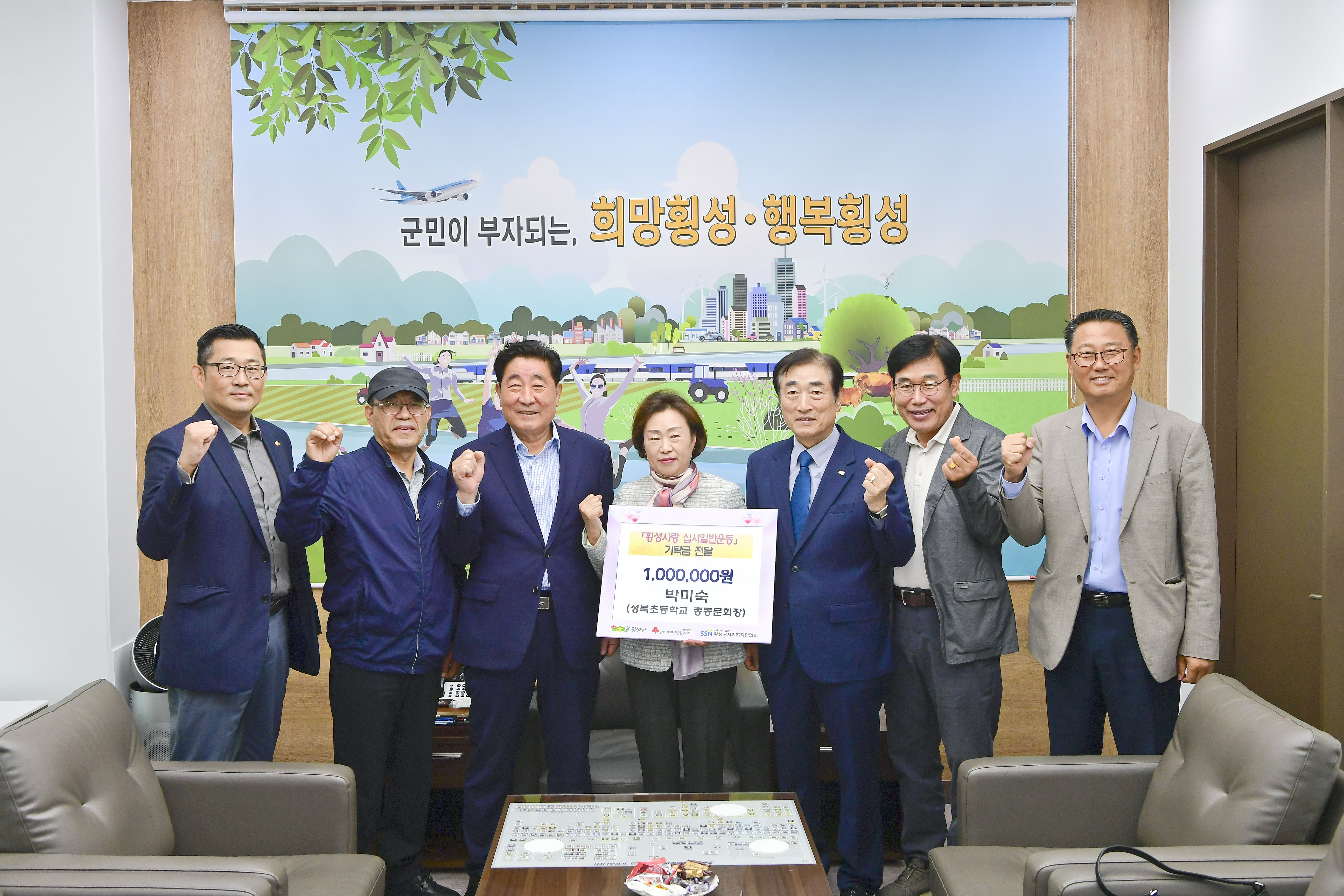 [강원사회복지신문 홍기한 기자]=박미숙 성북초등학교 총동문회장은 지난 10월 13일 10시 군수 집무실에서 '횡성사랑 십시일반운동'에 동참하는 의미에서 100만원의 기탁금을 기부했다.