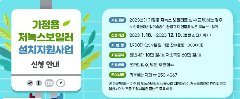 [강원사회복지신문 홍기한 기자]=2023년 가정용 저녹스 보일러 설치 신청, 오는 12월 10일 마감 내년부터 지원 대상 축소 예정, 물량 소진 시까지 신청 가능 춘천시가 가정용 저녹스 보일러 설치 지원사업 참여를 적극적으로 홍보하고 있다. 가정용 저녹스 보일러 설치 지원사업은 일반세대는 1대당 10만 원 저소득층 1대당 ...