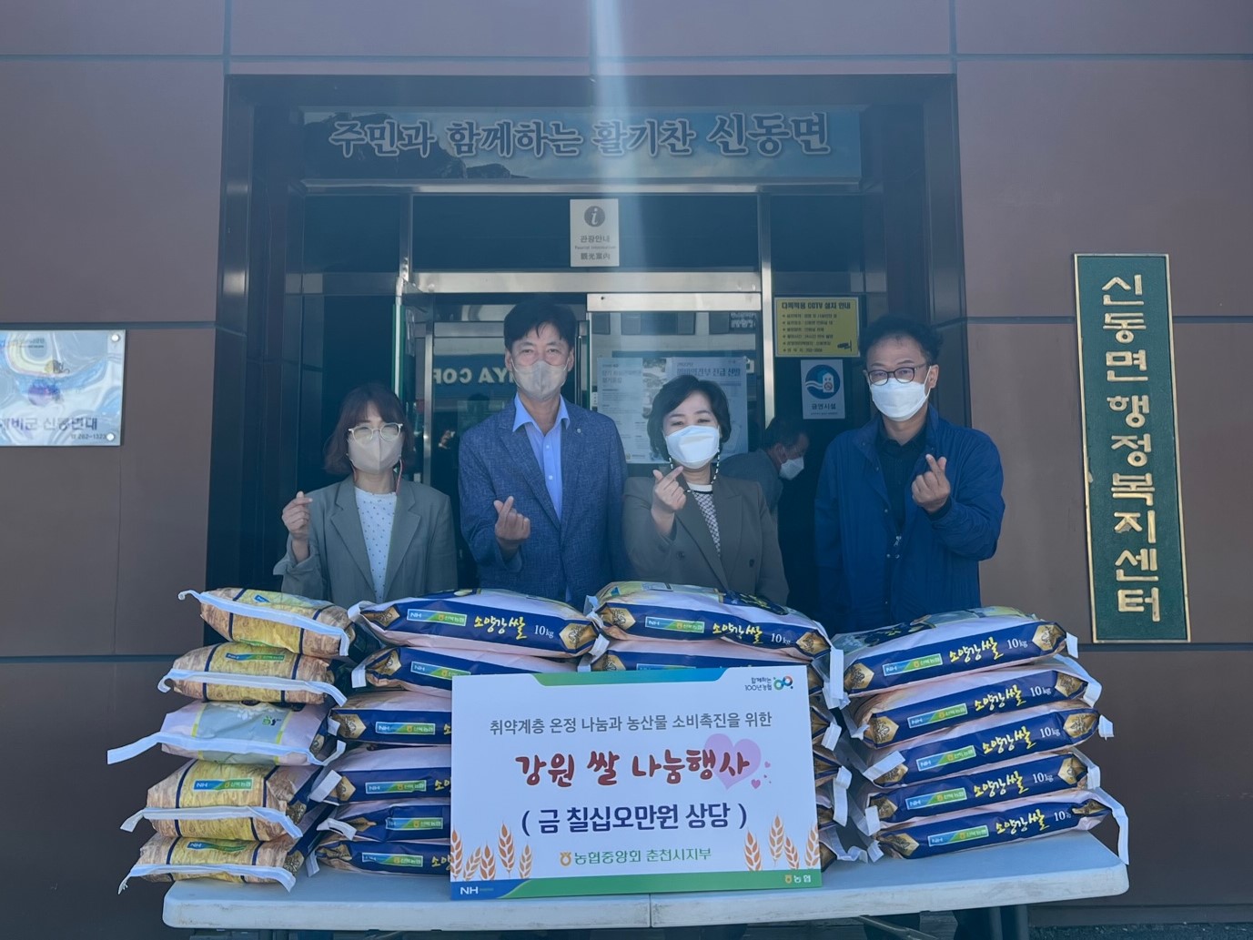 [강원사회복지신문 홍기한 기자]=농협중앙회 춘천시지부(지부장:김경선)는 지난 9월 21일 양곡 10kg 22포를 춘천시 신동면 행정복지센터에 전달했다.