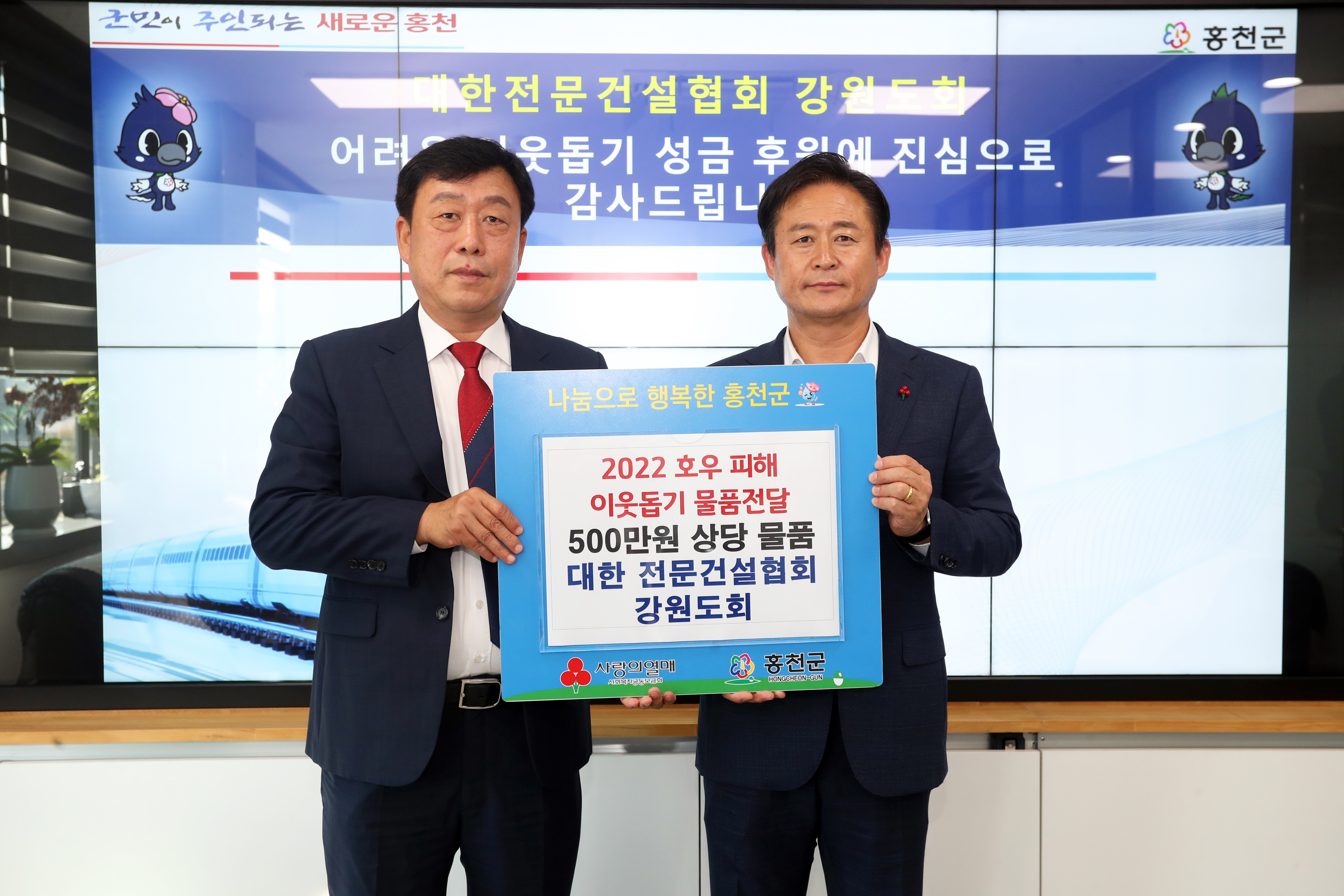 [강원사회복지신문 홍기한 기자]=대한 전문건설협회 강원도회(회장 박용석)는 지난 9월 20일 홍천군청을 방문, 2022년 호우피해 어려운 이웃돕기 후원물품을 전달했다. 후원물품은 500만원 상당으로, 호우피해 이재민 가구에 필요한 물품으로 전달될 예정이다. 박용석 회장은 "호우 피해로 생활에 어려움을 겪고 있을 이재민...