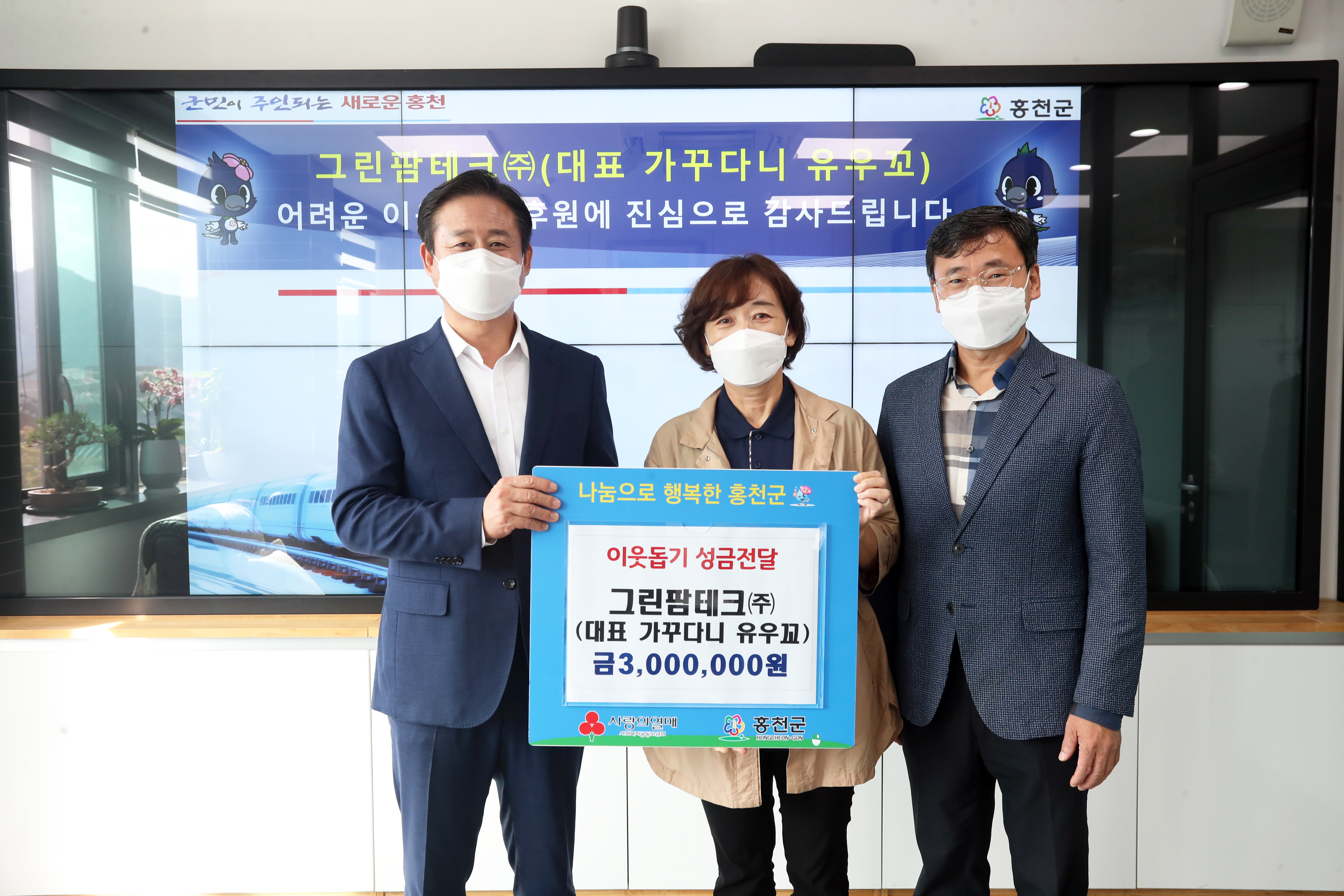 [강원사회복지신문 김도연 기자]=그린팜테크(주)(대표 가꾸다니 유우꼬)는 지난 9월 15일 홍천군청을 방문, 어려운 이웃돕기 성금 300만원을 기탁했다. 가꾸다니 유우꼬 대표는 "주위 어려운 이웃들에게 조금이나마 도움이 되고자 후원을 하게 됐다"며 "필요한 곳에 의미 있게 전달되길 바란다"고 말했다. 신영재 홍천군수는...