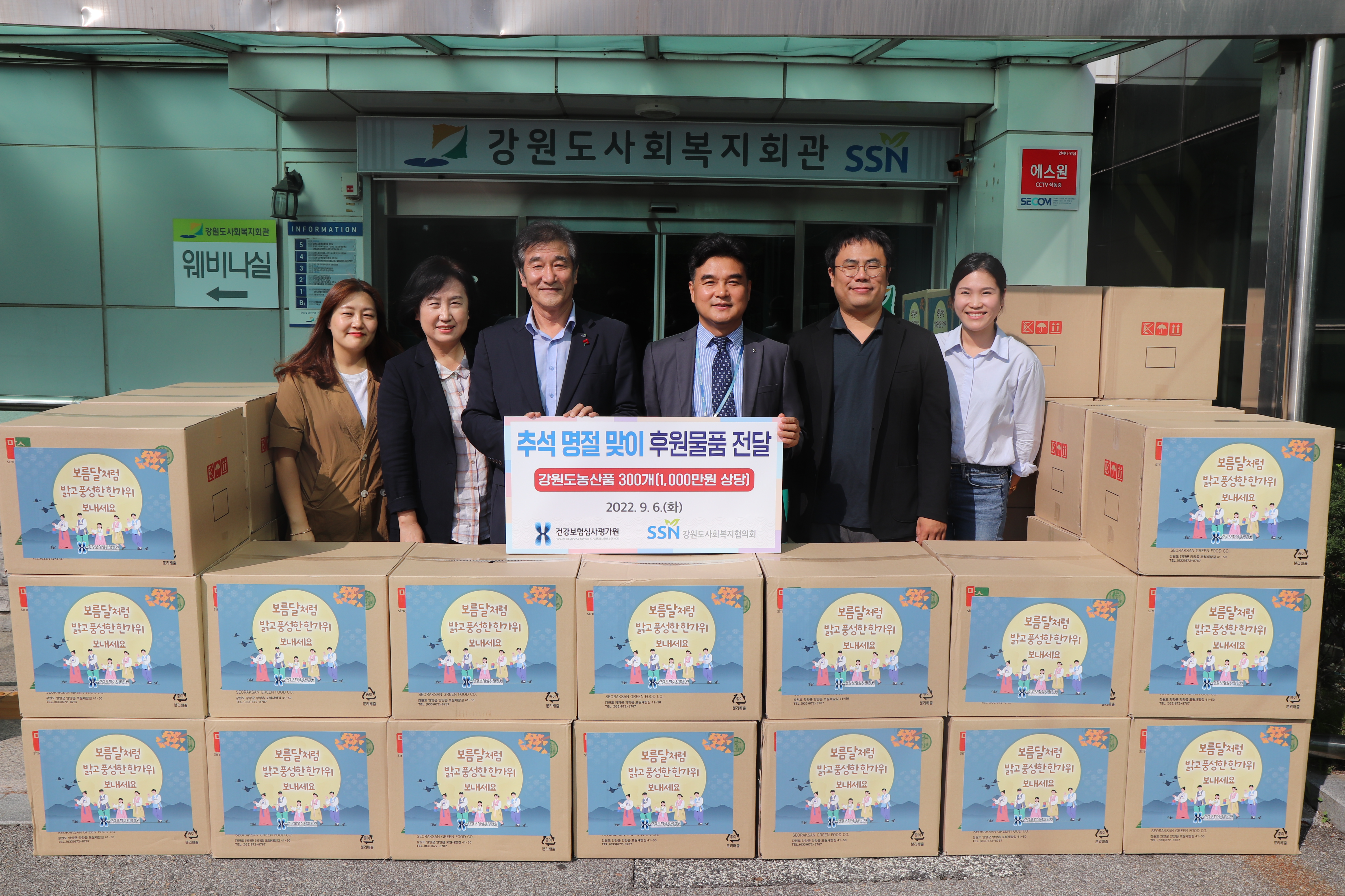 [강원사회복지신문 이정환 기자]=건강보험심사평가원(원장 김선민)은 지난 9월 6일 오후 3시 강원도사회복지회관에서 추석 명절 맞이 강원도농산품(200g, 300개 / 10,000천원 상당)을 강원도사회공헌정보센터(센터장 홍기종)에 기탁하여 전달식을 가졌다. 건강보험심사평가원에서 기탁한 강원도농산품(200g, 300개 / 10,000천...