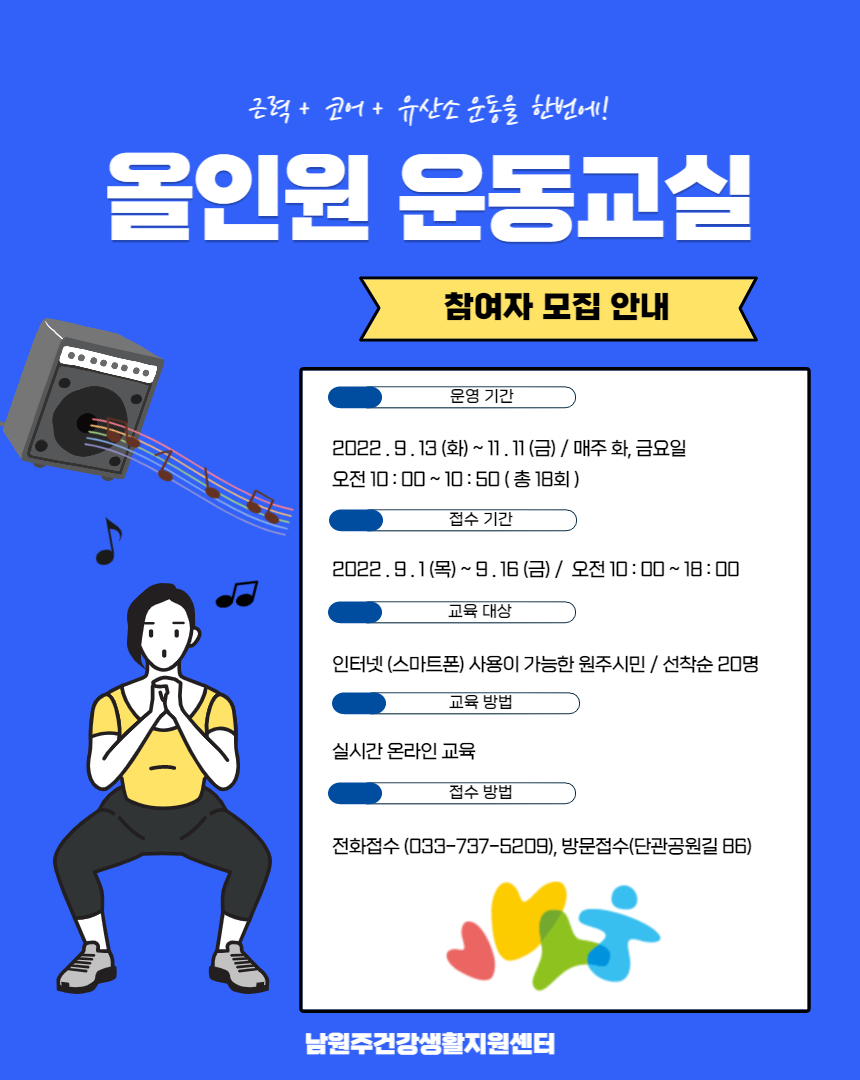 [강원사회복지신문 서은진 기자]=남원주건강생활지원센터는 오는 9월 13일 원주시민을 대상으로 '근력+코어+유산소 운동을 한 번에! 올인원 운동 교실'을 시작한다. 이번 강좌는 코로나19 장기화로 신체활동이 감소돼 근육의 피로도가 증가하고 있는 시기에 간단한 스트레칭과 근력·유산소 운동으로 근육의 긴장도를 풀어주...