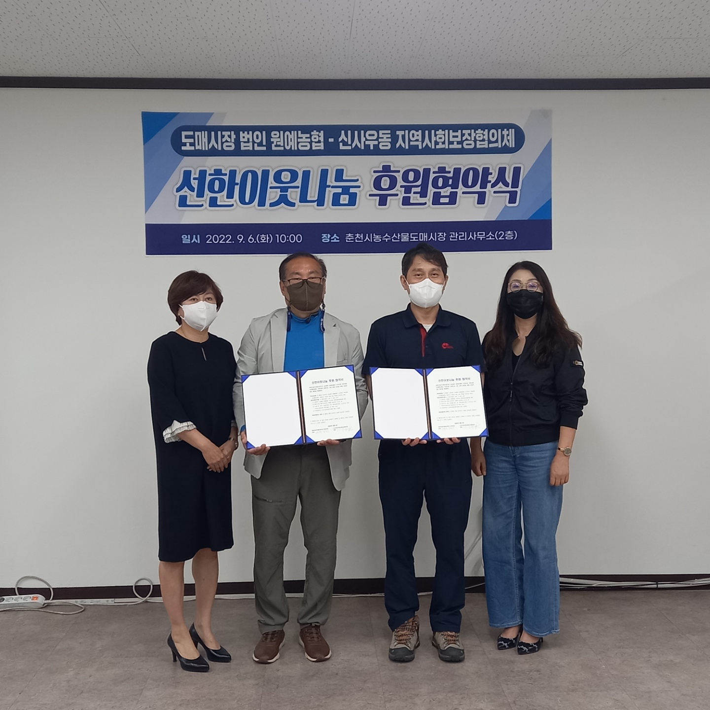 [강원사회복지신문 홍기한 기자]=춘천시농수산물도매시장 소속법인 원예농협은 지난 9월 6일 춘천시 신사우동 지역사회보장협의체와 1년간 선한 이웃 나눔 후원 협약을 맺었다. 신사우동 저소득층 가정에 도움을 주기 위해 9월부터 내년 8월까지 월 1회, 매월 둘째주 수요일에 일정량의 과일을 지원하기로 한 것이다. 후원대...