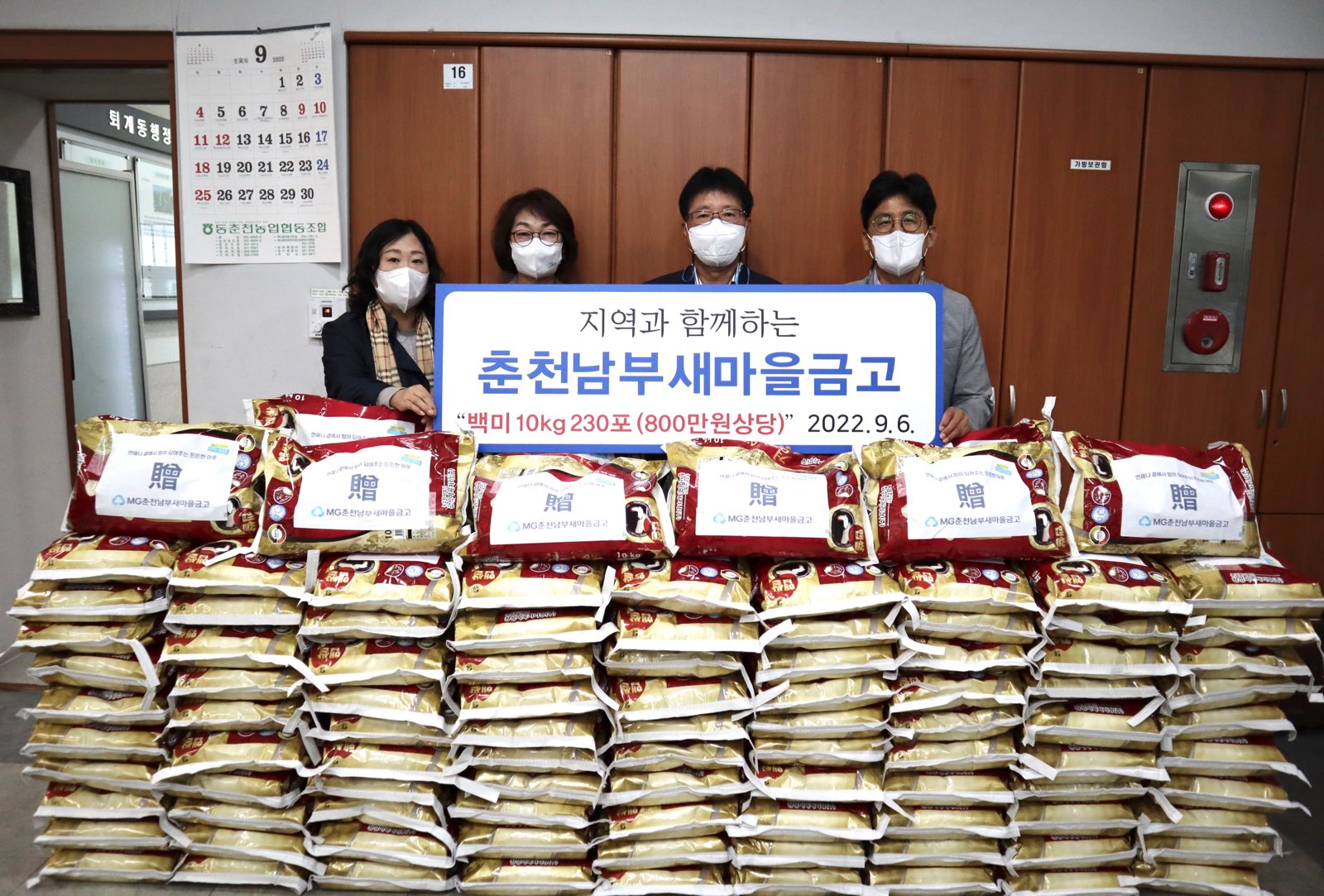 [강원사회복지신문 홍기한 기자]=춘천 남부새마을금고(이사장: 정용현)는 지난 9월 6일 춘천시 퇴계동 행정복지센터를 관내 불우한 이웃을 위한 양곡 100포대(쌀, 400만원상당)를 전달했다.