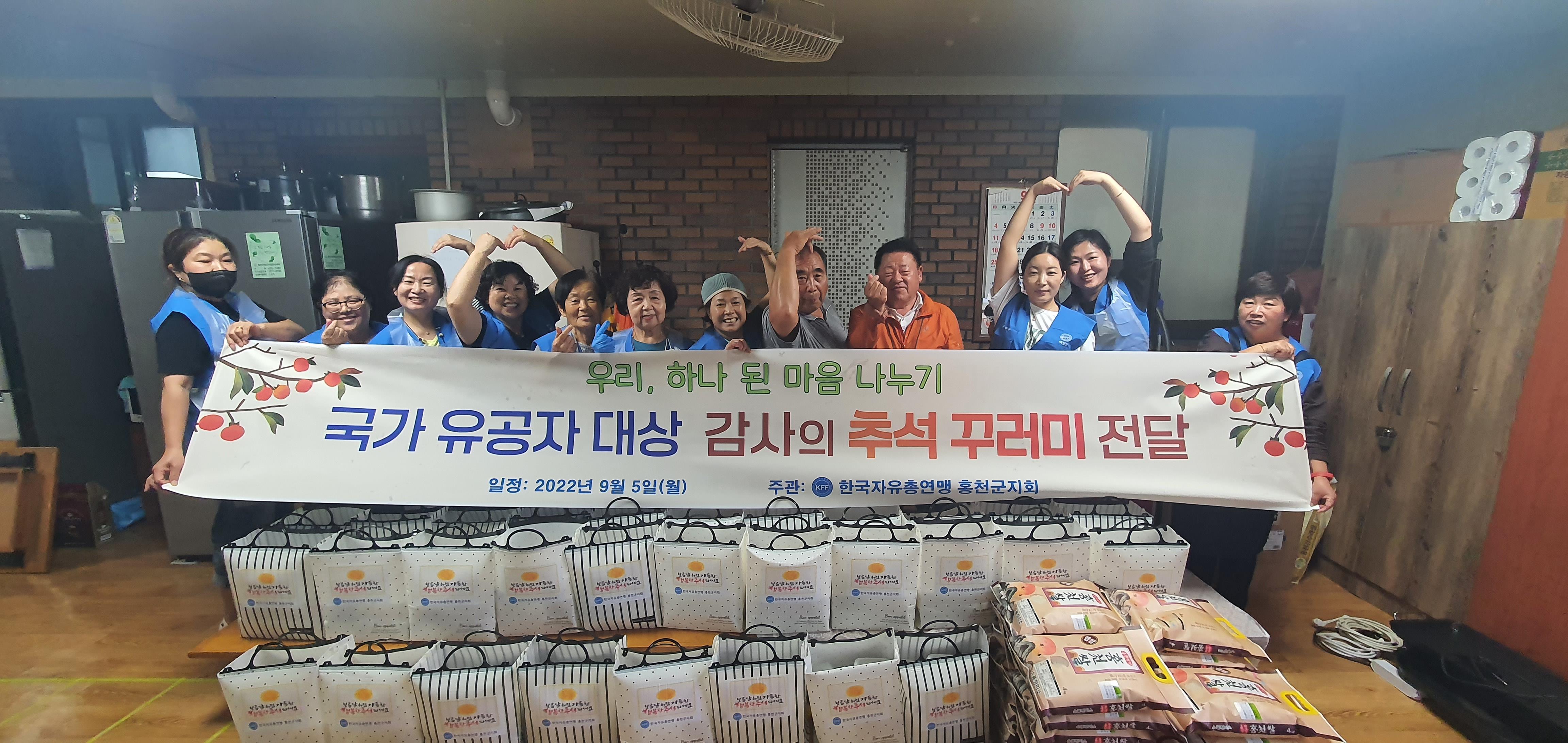 [강원사회복지신문 이정환 기자]=한국자유총연맹 홍천군지회(지회장 이희덕)는 지난 9월 5일 홍천군 화촌면 굴운리 경로당에서 '우리, 하나 된 마음 나누기' 행사를 진행했다. 행사는 민족고유 명절인 추석을 맞아 나라를 위해 희생하신 국가유공자를 대상으로 명절음식을 전달하는 사업으로, 올해에는 40여 가구를 대상으로...