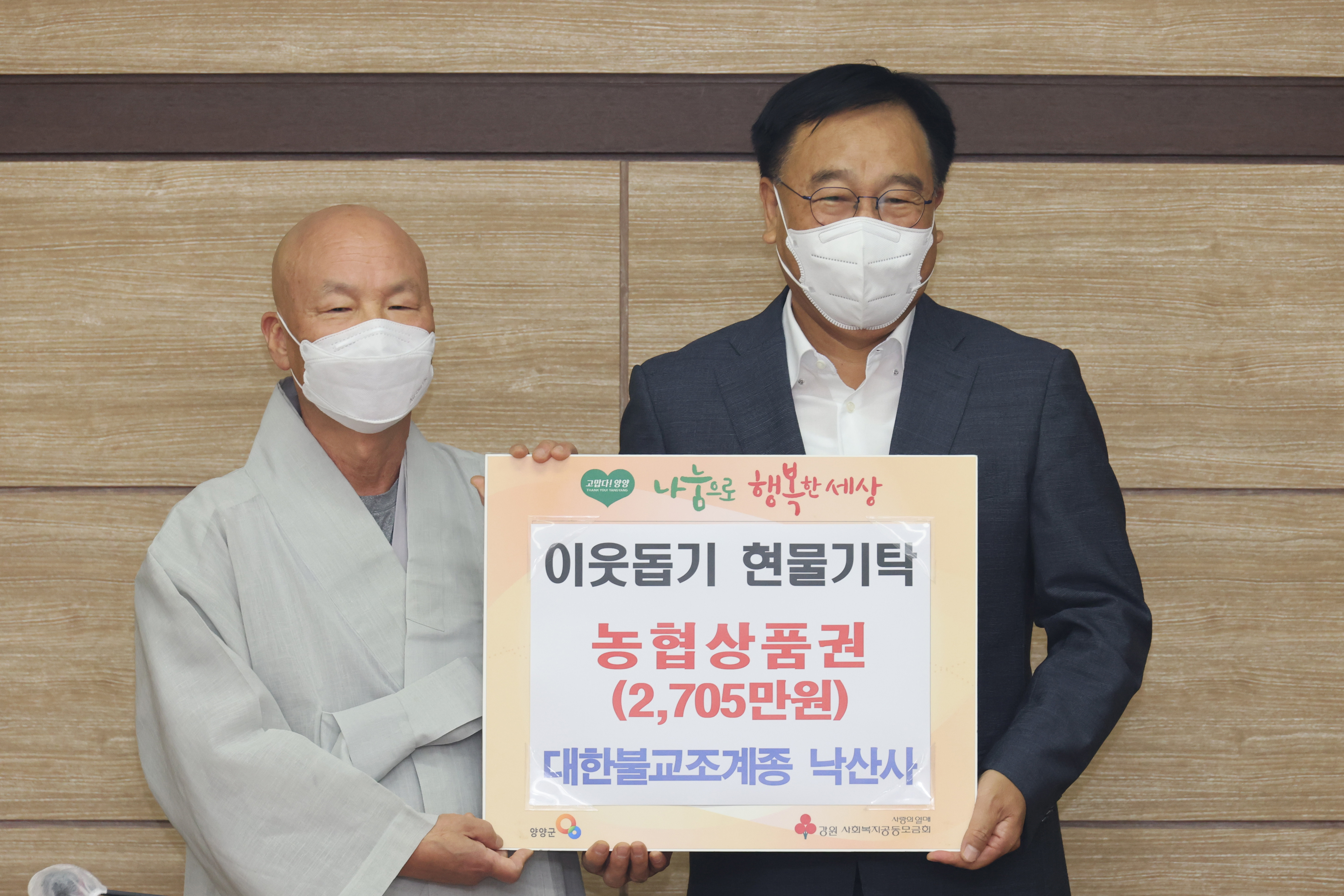 [강원사회복지신문 서은진 기자]=추석 맞아 군민 등에 1억2천만 원 상당 성금(물품) 전달 천년관음성지인 대한불교조계종 양양 낙산사(주지 마근스님)가 추석을 맞아 군민들과 어려운 이웃들이 풍성한 한가위를 보낼 수 있도록 맞춤형 자비 나눔 행사를 봉행했다. 낙산사는 지난 9월 5일 오전 10시 양양군청을 방문해 김진하...